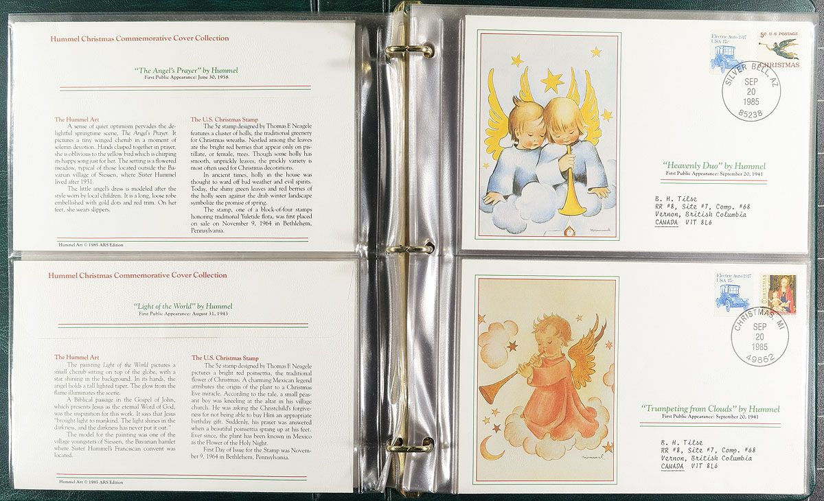 Bankers box crammed with a range of US material including three binders with stamps, blocks and cancels. Noted a couple hundred uncacheted FDCs and cacheted event covers from the 1950’s-1970’s, including a binder with about 25 Hummel Christmas themed covers, with winter or Christmas themed cancels on nice cachets (original cost would have been significant). While most of the stamps are used, we did notice about US$40.00 of modern postage from the 33c era. Every remaining space in the box is filled with envelopes and baggies filled with stamps. Estimate =