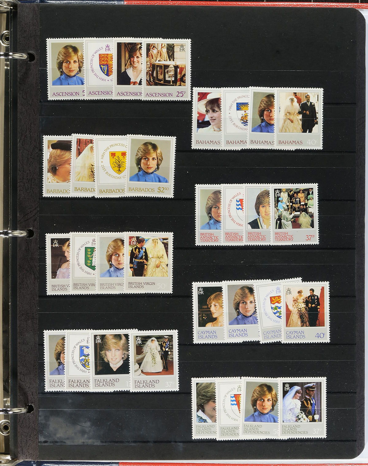 British Commonwealth "Royalty" Hoard. Small book box, filled with a wide variety of mostly mint material including singles, sets, albums, presentation booklets, souvenir editions, booklets, covers / postcards and souvenir sheets. A total of 332 single stamps, 18 first day covers / postcards, 35 souvenir sheets, 39 stamp booklets, 1 souvenir folder and 48 presentation packages (from various countries). Noted material from Great Britain, Jamaica, Jersey, Kiribati, Montserrat, Nevis, Tuvalu, Antigua, Barbuda, Aitutaki, St Lucia, St Vincent, Seychelles, Niue, Tanzania, Uganda, Dominica, Kenya, Anguilla, Grenada, Cook Islands, Grenadines, Ghana, Turks & Caicos, St. Kitts and Penrhyn. The lot would represent an astonishing original retail cost. Also included is a Stanley Gibbons Royal Wedding catalogue and stamp colour guide. Estimate =