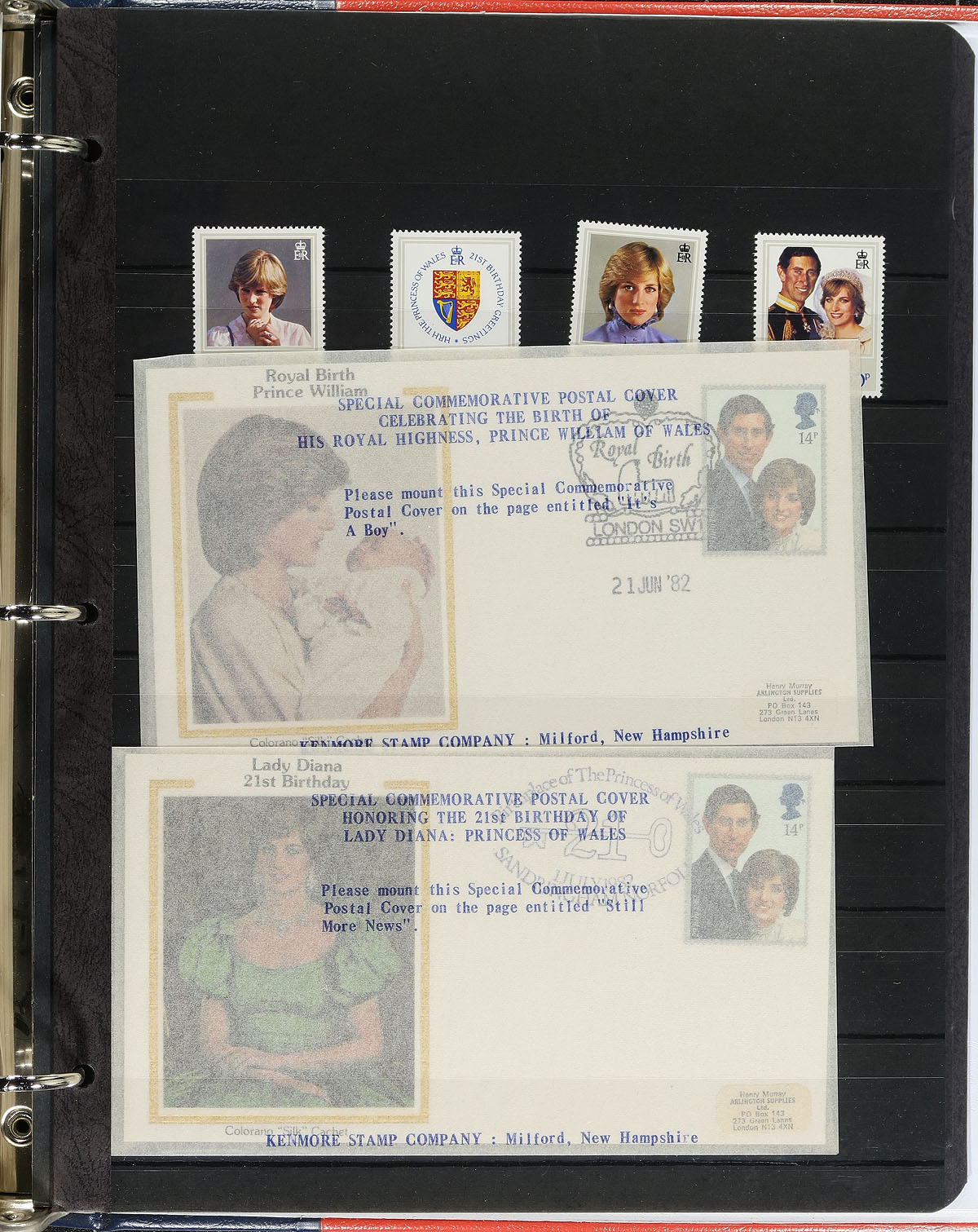 British Commonwealth "Royalty" Hoard. Small book box, filled with a wide variety of mostly mint material including singles, sets, albums, presentation booklets, souvenir editions, booklets, covers / postcards and souvenir sheets. A total of 332 single stamps, 18 first day covers / postcards, 35 souvenir sheets, 39 stamp booklets, 1 souvenir folder and 48 presentation packages (from various countries). Noted material from Great Britain, Jamaica, Jersey, Kiribati, Montserrat, Nevis, Tuvalu, Antigua, Barbuda, Aitutaki, St Lucia, St Vincent, Seychelles, Niue, Tanzania, Uganda, Dominica, Kenya, Anguilla, Grenada, Cook Islands, Grenadines, Ghana, Turks & Caicos, St. Kitts and Penrhyn. The lot would represent an astonishing original retail cost. Also included is a Stanley Gibbons Royal Wedding catalogue and stamp colour guide. Estimate =