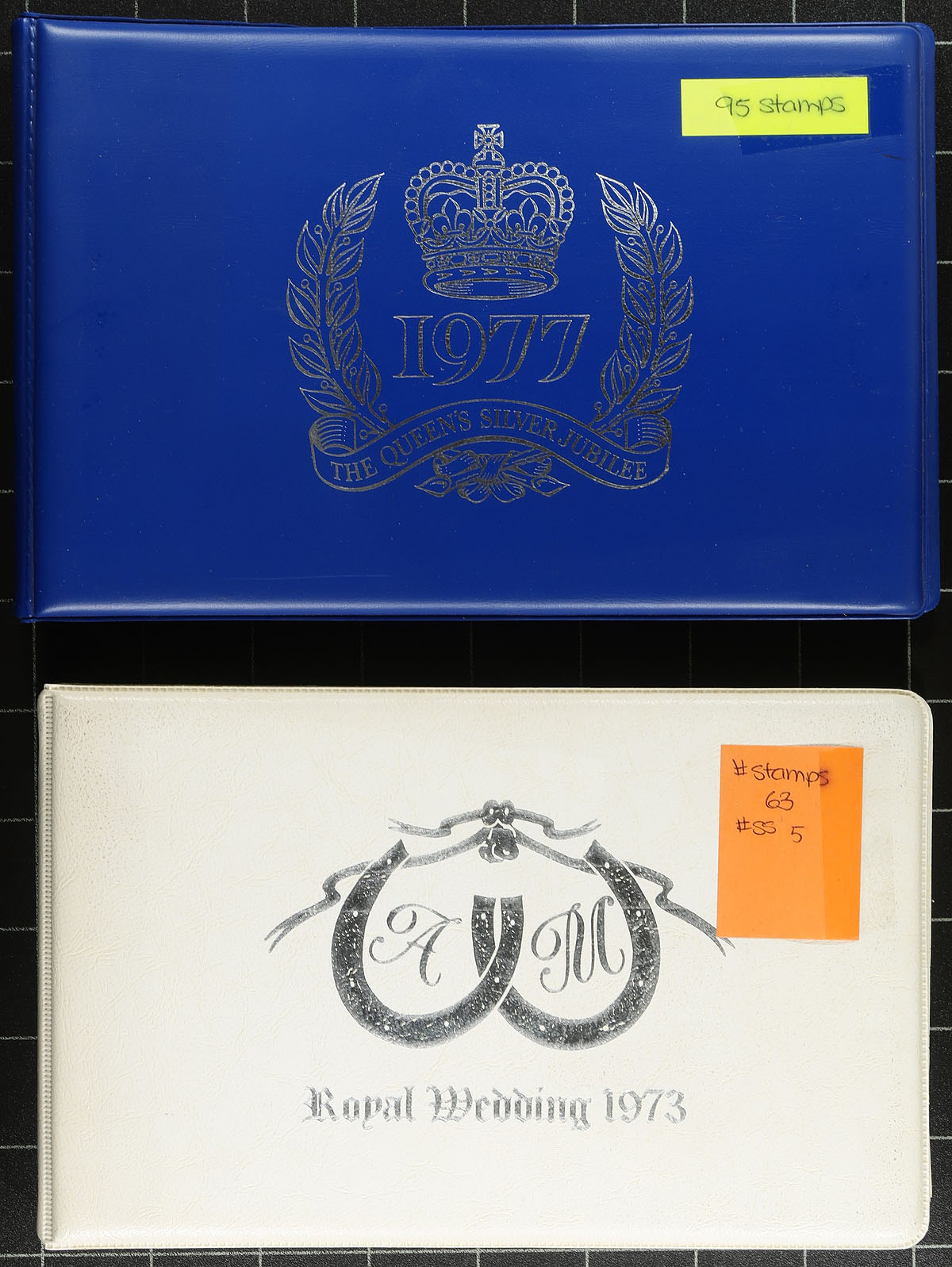 British Commonwealth "Royalty" Hoard. Small book box, filled with a wide variety of mostly mint material including singles, sets, albums, presentation booklets, souvenir editions, booklets, covers / postcards and souvenir sheets. A total of 332 single stamps, 18 first day covers / postcards, 35 souvenir sheets, 39 stamp booklets, 1 souvenir folder and 48 presentation packages (from various countries). Noted material from Great Britain, Jamaica, Jersey, Kiribati, Montserrat, Nevis, Tuvalu, Antigua, Barbuda, Aitutaki, St Lucia, St Vincent, Seychelles, Niue, Tanzania, Uganda, Dominica, Kenya, Anguilla, Grenada, Cook Islands, Grenadines, Ghana, Turks & Caicos, St. Kitts and Penrhyn. The lot would represent an astonishing original retail cost. Also included is a Stanley Gibbons Royal Wedding catalogue and stamp colour guide. Estimate =