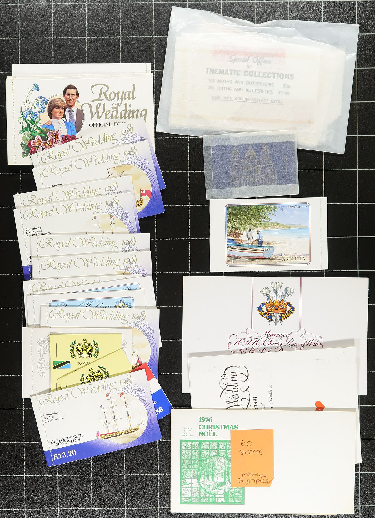 British Commonwealth "Royalty" Hoard. Small book box, filled with a wide variety of mostly mint material including singles, sets, albums, presentation booklets, souvenir editions, booklets, covers / postcards and souvenir sheets. A total of 332 single stamps, 18 first day covers / postcards, 35 souvenir sheets, 39 stamp booklets, 1 souvenir folder and 48 presentation packages (from various countries). Noted material from Great Britain, Jamaica, Jersey, Kiribati, Montserrat, Nevis, Tuvalu, Antigua, Barbuda, Aitutaki, St Lucia, St Vincent, Seychelles, Niue, Tanzania, Uganda, Dominica, Kenya, Anguilla, Grenada, Cook Islands, Grenadines, Ghana, Turks & Caicos, St. Kitts and Penrhyn. The lot would represent an astonishing original retail cost. Also included is a Stanley Gibbons Royal Wedding catalogue and stamp colour guide. Estimate =