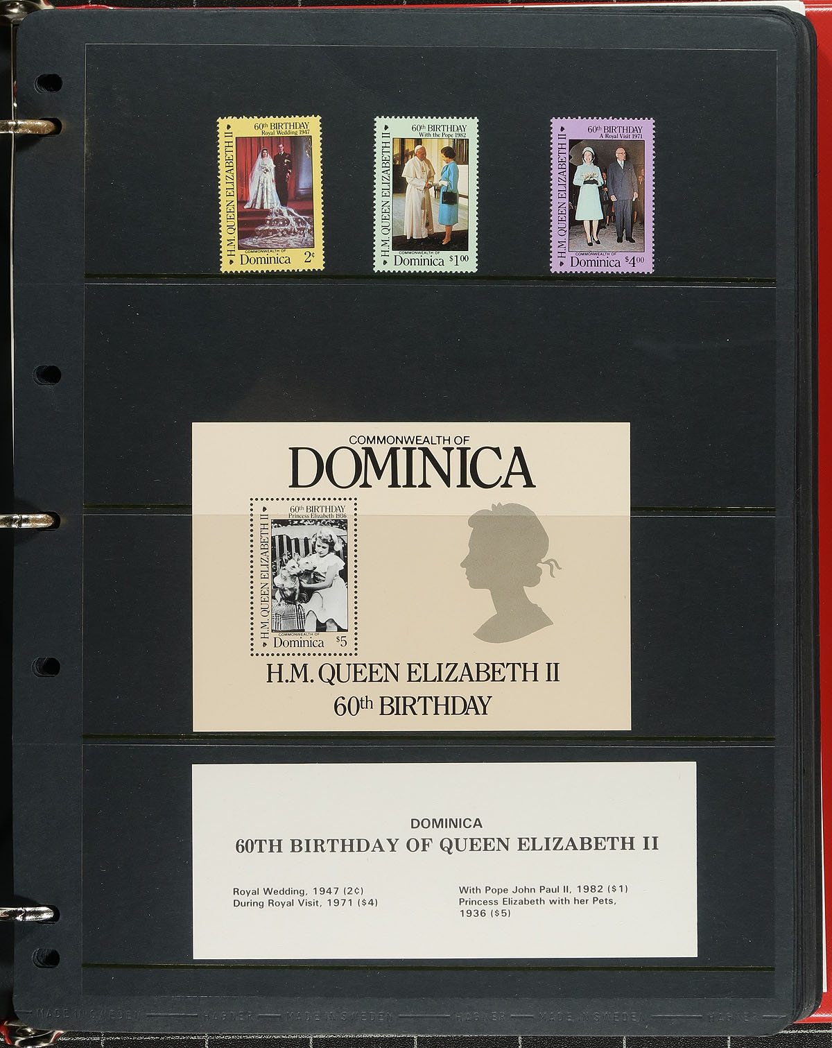 British Commonwealth "Royalty" Hoard. Small book box, filled with a wide variety of mostly mint material including singles, sets, albums, presentation booklets, souvenir editions, booklets, covers / postcards and souvenir sheets. A total of 332 single stamps, 18 first day covers / postcards, 35 souvenir sheets, 39 stamp booklets, 1 souvenir folder and 48 presentation packages (from various countries). Noted material from Great Britain, Jamaica, Jersey, Kiribati, Montserrat, Nevis, Tuvalu, Antigua, Barbuda, Aitutaki, St Lucia, St Vincent, Seychelles, Niue, Tanzania, Uganda, Dominica, Kenya, Anguilla, Grenada, Cook Islands, Grenadines, Ghana, Turks & Caicos, St. Kitts and Penrhyn. The lot would represent an astonishing original retail cost. Also included is a Stanley Gibbons Royal Wedding catalogue and stamp colour guide. Estimate =