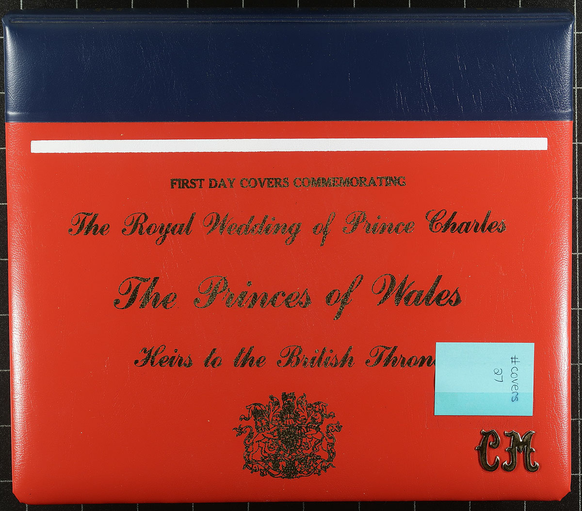 British Commonwealth "Royalty" Hoard. Small book box, filled with a wide variety of mostly mint material including singles, sets, albums, presentation booklets, souvenir editions, booklets, covers / postcards and souvenir sheets. A total of 332 single stamps, 18 first day covers / postcards, 35 souvenir sheets, 39 stamp booklets, 1 souvenir folder and 48 presentation packages (from various countries). Noted material from Great Britain, Jamaica, Jersey, Kiribati, Montserrat, Nevis, Tuvalu, Antigua, Barbuda, Aitutaki, St Lucia, St Vincent, Seychelles, Niue, Tanzania, Uganda, Dominica, Kenya, Anguilla, Grenada, Cook Islands, Grenadines, Ghana, Turks & Caicos, St. Kitts and Penrhyn. The lot would represent an astonishing original retail cost. Also included is a Stanley Gibbons Royal Wedding catalogue and stamp colour guide. Estimate =