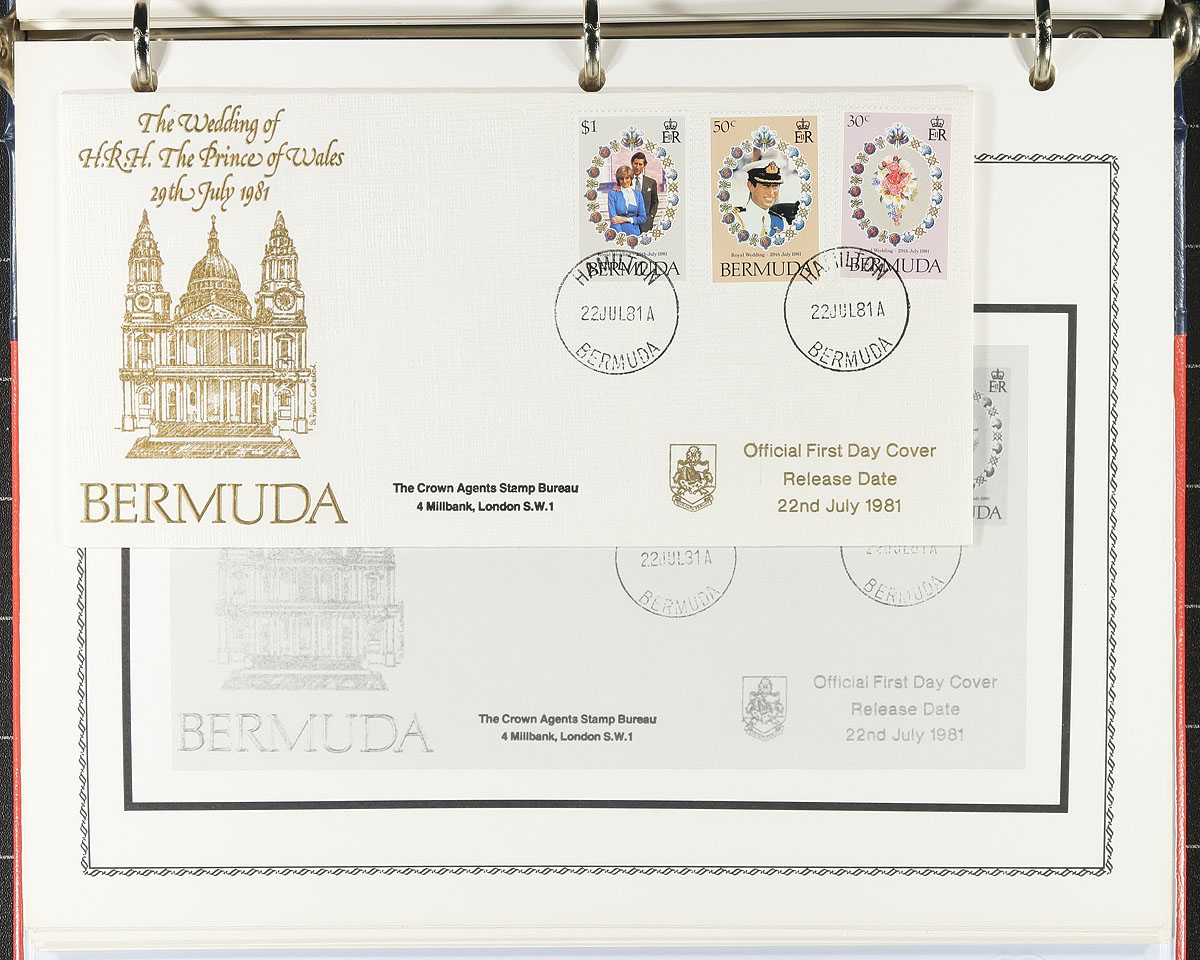 British Commonwealth "Royalty" Hoard. Small book box, filled with a wide variety of mostly mint material including singles, sets, albums, presentation booklets, souvenir editions, booklets, covers / postcards and souvenir sheets. A total of 332 single stamps, 18 first day covers / postcards, 35 souvenir sheets, 39 stamp booklets, 1 souvenir folder and 48 presentation packages (from various countries). Noted material from Great Britain, Jamaica, Jersey, Kiribati, Montserrat, Nevis, Tuvalu, Antigua, Barbuda, Aitutaki, St Lucia, St Vincent, Seychelles, Niue, Tanzania, Uganda, Dominica, Kenya, Anguilla, Grenada, Cook Islands, Grenadines, Ghana, Turks & Caicos, St. Kitts and Penrhyn. The lot would represent an astonishing original retail cost. Also included is a Stanley Gibbons Royal Wedding catalogue and stamp colour guide. Estimate =