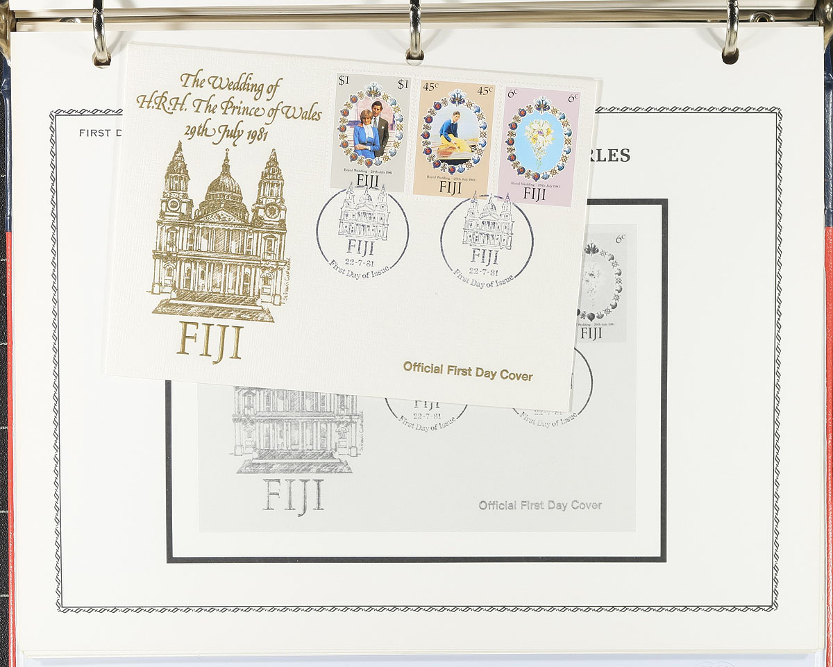 British Commonwealth "Royalty" Hoard. Small book box, filled with a wide variety of mostly mint material including singles, sets, albums, presentation booklets, souvenir editions, booklets, covers / postcards and souvenir sheets. A total of 332 single stamps, 18 first day covers / postcards, 35 souvenir sheets, 39 stamp booklets, 1 souvenir folder and 48 presentation packages (from various countries). Noted material from Great Britain, Jamaica, Jersey, Kiribati, Montserrat, Nevis, Tuvalu, Antigua, Barbuda, Aitutaki, St Lucia, St Vincent, Seychelles, Niue, Tanzania, Uganda, Dominica, Kenya, Anguilla, Grenada, Cook Islands, Grenadines, Ghana, Turks & Caicos, St. Kitts and Penrhyn. The lot would represent an astonishing original retail cost. Also included is a Stanley Gibbons Royal Wedding catalogue and stamp colour guide. Estimate =