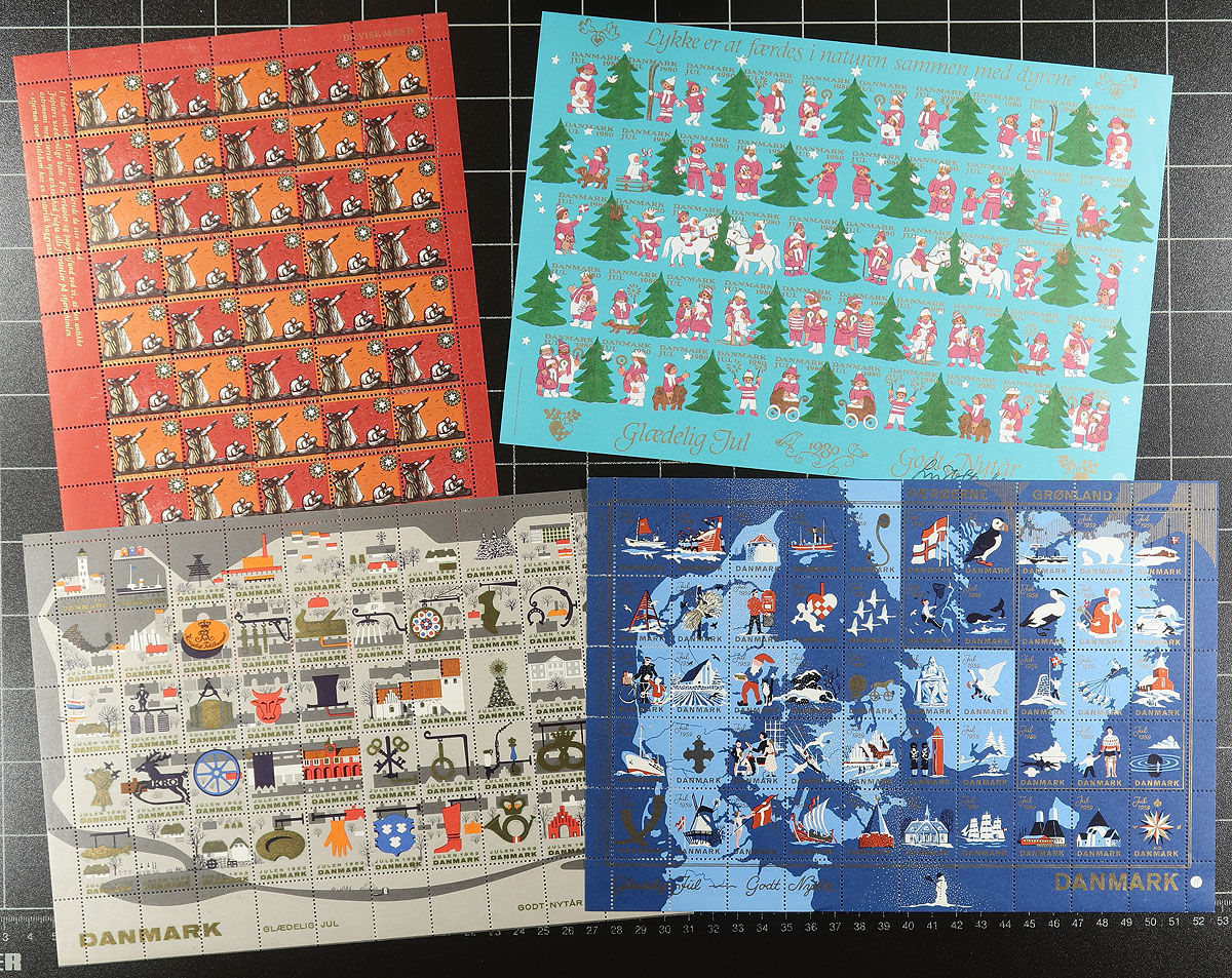 Extensive Scandinavian accumulation of Christmas seals and charity labels from 1905 to about 2000, often listed in Facit, but not Scott. Includes singles, complete panes, original, reprints which will enhance any Northern European collection. Heavy in the Denmark including a 1950 imperforate pane and 1980 pane signed by the artist. There are 8 complete panes of Faroe Islands Christmas labels from 1976-1985, plus 6 complete and one partial panes of similar issues from Greenland. Omitting the few faulty stamps in the group, the owner’s fastidious cataloguing by Facit comes out to about 15,000 Danish Kroner = $3,000. CDN. Estimate =