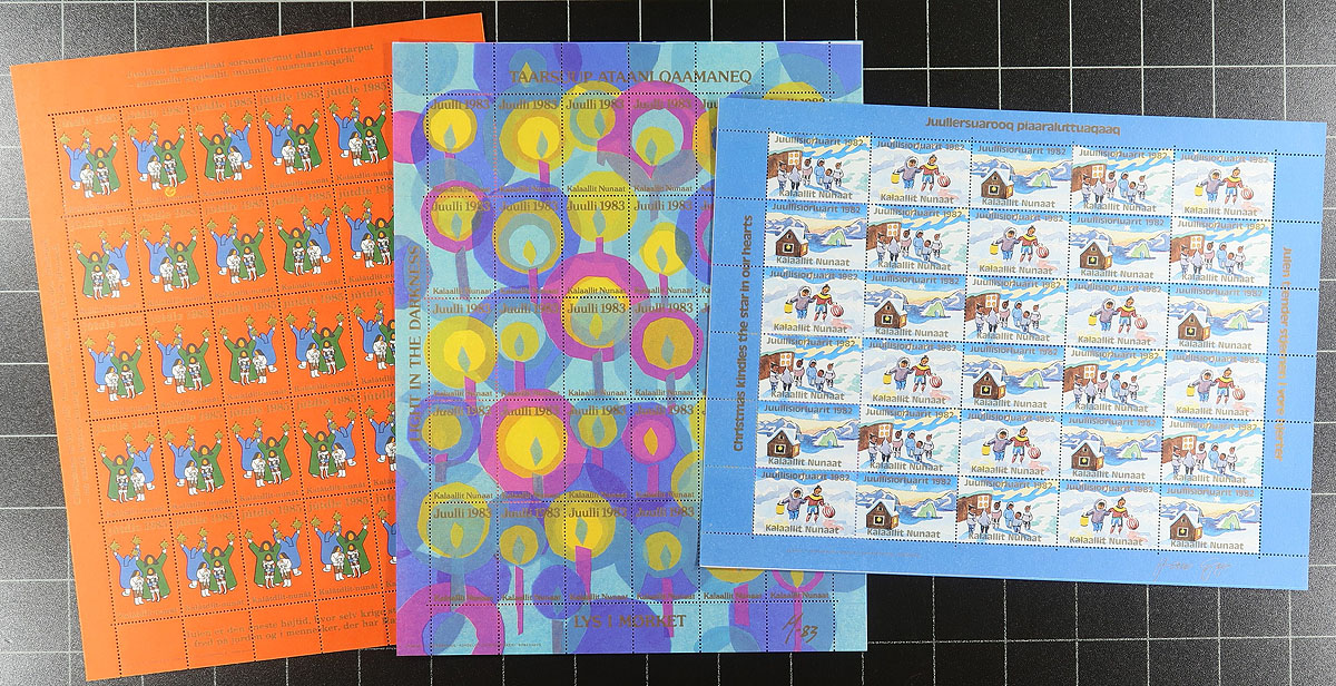 Extensive Scandinavian accumulation of Christmas seals and charity labels from 1905 to about 2000, often listed in Facit, but not Scott. Includes singles, complete panes, original, reprints which will enhance any Northern European collection. Heavy in the Denmark including a 1950 imperforate pane and 1980 pane signed by the artist. There are 8 complete panes of Faroe Islands Christmas labels from 1976-1985, plus 6 complete and one partial panes of similar issues from Greenland. Omitting the few faulty stamps in the group, the owner’s fastidious cataloguing by Facit comes out to about 15,000 Danish Kroner = $3,000. CDN. Estimate =
