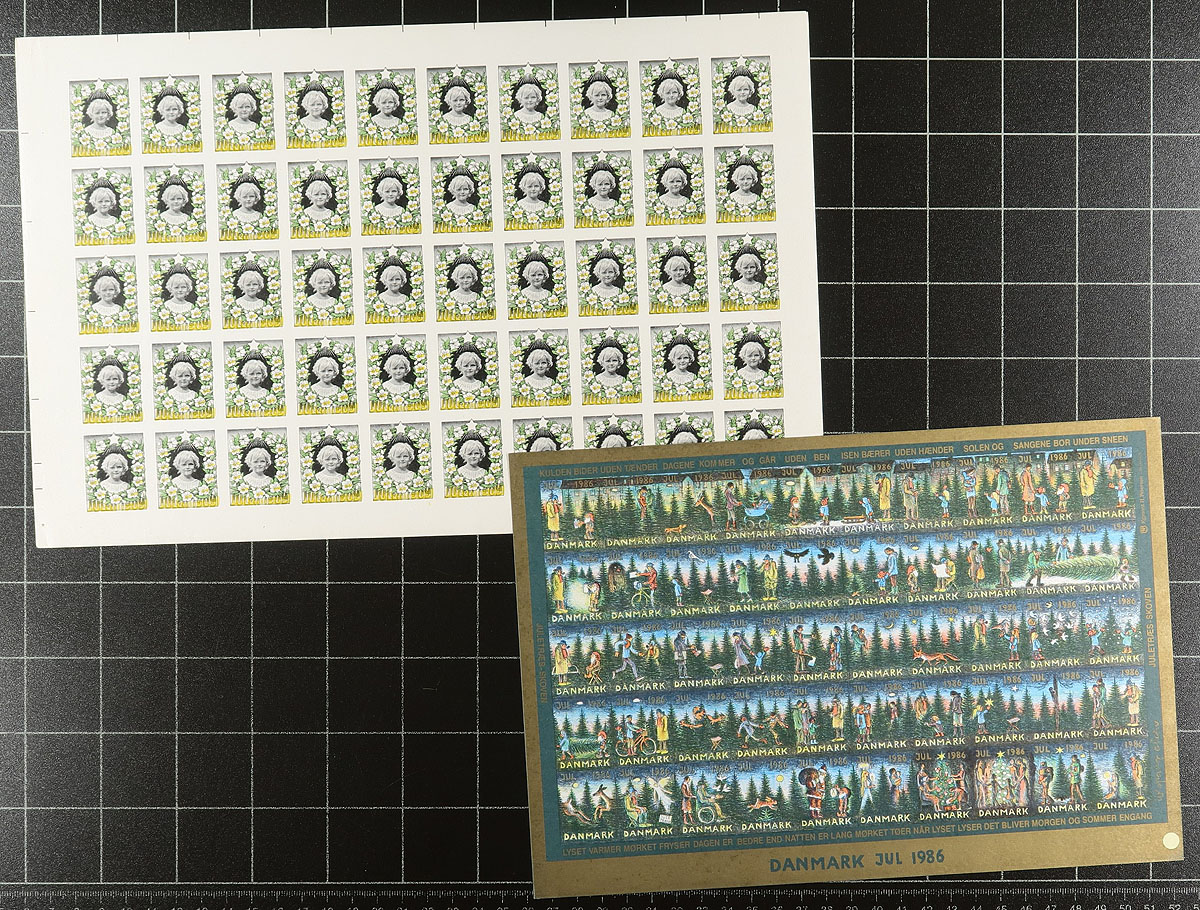 Extensive Scandinavian accumulation of Christmas seals and charity labels from 1905 to about 2000, often listed in Facit, but not Scott. Includes singles, complete panes, original, reprints which will enhance any Northern European collection. Heavy in the Denmark including a 1950 imperforate pane and 1980 pane signed by the artist. There are 8 complete panes of Faroe Islands Christmas labels from 1976-1985, plus 6 complete and one partial panes of similar issues from Greenland. Omitting the few faulty stamps in the group, the owner’s fastidious cataloguing by Facit comes out to about 15,000 Danish Kroner = $3,000. CDN. Estimate =