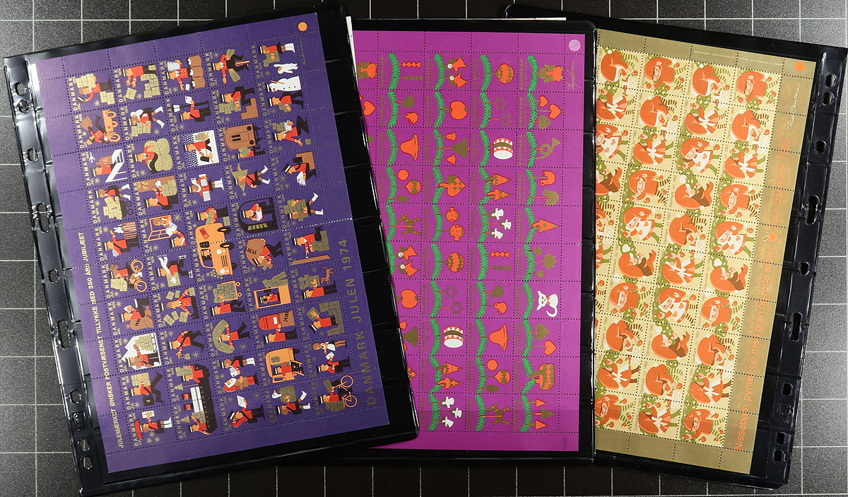 Extensive Scandinavian accumulation of Christmas seals and charity labels from 1905 to about 2000, often listed in Facit, but not Scott. Includes singles, complete panes, original, reprints which will enhance any Northern European collection. Heavy in the Denmark including a 1950 imperforate pane and 1980 pane signed by the artist. There are 8 complete panes of Faroe Islands Christmas labels from 1976-1985, plus 6 complete and one partial panes of similar issues from Greenland. Omitting the few faulty stamps in the group, the owner’s fastidious cataloguing by Facit comes out to about 15,000 Danish Kroner = $3,000. CDN. Estimate =