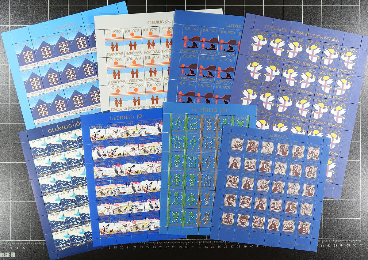 Extensive Scandinavian accumulation of Christmas seals and charity labels from 1905 to about 2000, often listed in Facit, but not Scott. Includes singles, complete panes, original, reprints which will enhance any Northern European collection. Heavy in the Denmark including a 1950 imperforate pane and 1980 pane signed by the artist. There are 8 complete panes of Faroe Islands Christmas labels from 1976-1985, plus 6 complete and one partial panes of similar issues from Greenland. Omitting the few faulty stamps in the group, the owner’s fastidious cataloguing by Facit comes out to about 15,000 Danish Kroner = $3,000. CDN. Estimate =