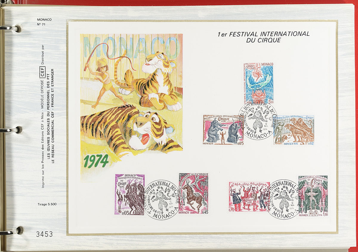 About 140 different "CEF" first day of issue commemorative panels issued between 1969-1980, housed in a pair of specialty binders. Each has a stamp, partial set or set, cancelled with a commemorative first day cancel with extensive text about each issue and individually numbered (most were produced in quantities of under 5500, each). CEF panel numbers 20 to 175, but there is a bit of disorganization. A few couple are dual country issues with France. Overall, the condition is excellent. Estimate =