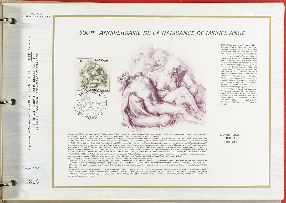 About 140 different "CEF" first day of issue commemorative panels issued between 1969-1980, housed in a pair of specialty binders. Each has a stamp, partial set or set, cancelled with a commemorative first day cancel with extensive text about each issue and individually numbered (most were produced in quantities of under 5500, each). CEF panel numbers 20 to 175, but there is a bit of disorganization. A few couple are dual country issues with France. Overall, the condition is excellent. Estimate =