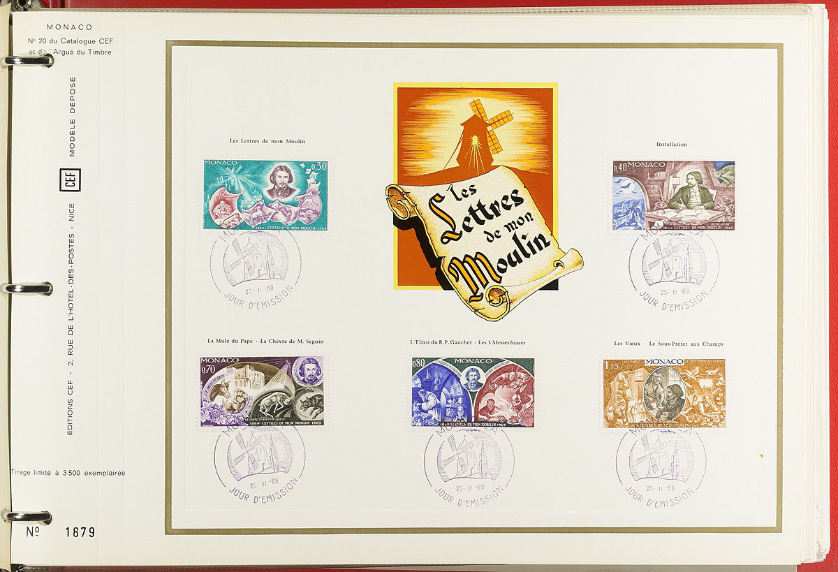 About 140 different "CEF" first day of issue commemorative panels issued between 1969-1980, housed in a pair of specialty binders. Each has a stamp, partial set or set, cancelled with a commemorative first day cancel with extensive text about each issue and individually numbered (most were produced in quantities of under 5500, each). CEF panel numbers 20 to 175, but there is a bit of disorganization. A few couple are dual country issues with France. Overall, the condition is excellent. Estimate =