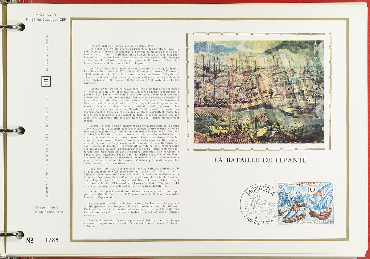 About 140 different "CEF" first day of issue commemorative panels issued between 1969-1980, housed in a pair of specialty binders. Each has a stamp, partial set or set, cancelled with a commemorative first day cancel with extensive text about each issue and individually numbered (most were produced in quantities of under 5500, each). CEF panel numbers 20 to 175, but there is a bit of disorganization. A few couple are dual country issues with France. Overall, the condition is excellent. Estimate =