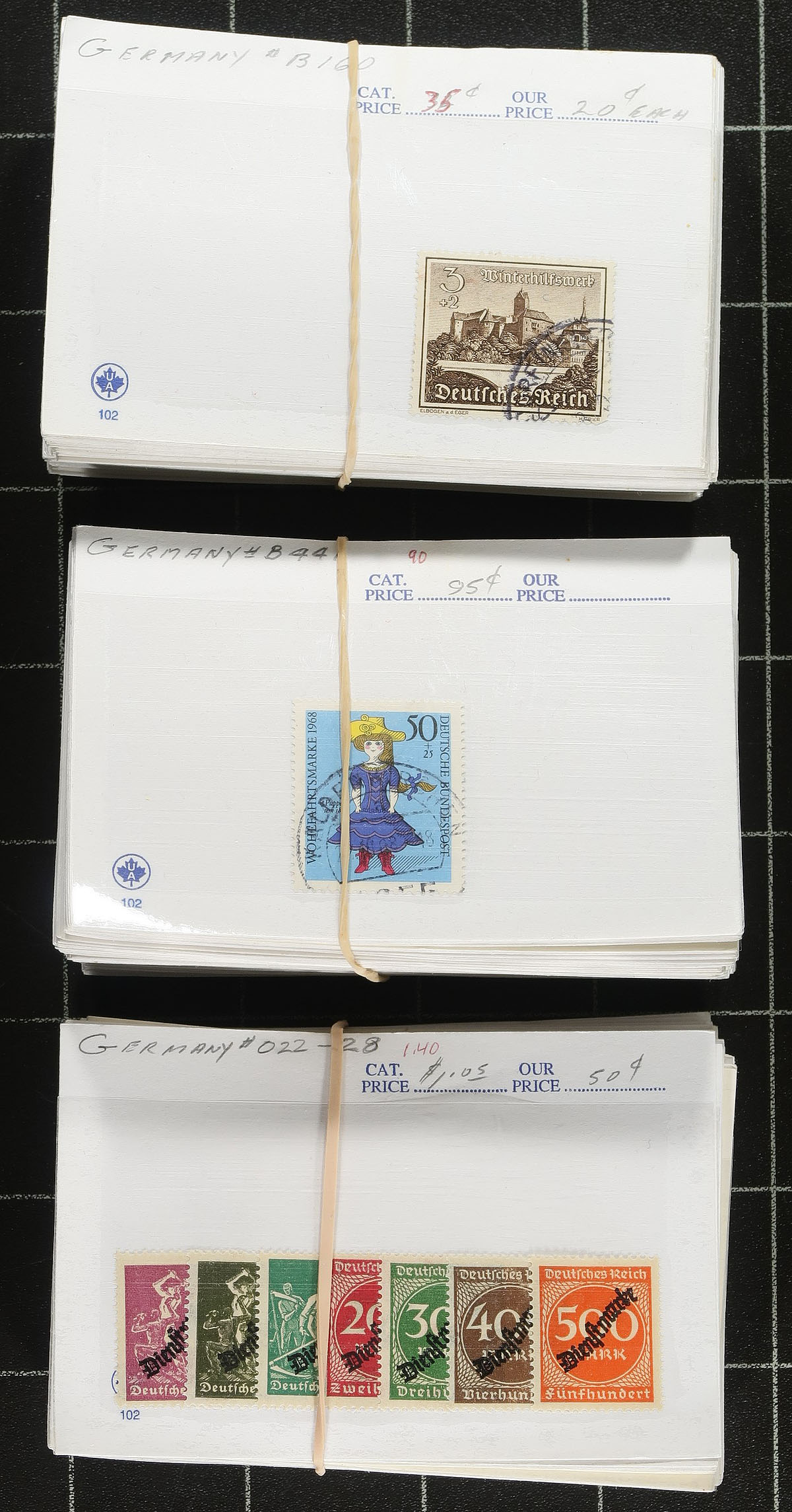 Several hundred stamps, neatly arranged and organized on old dealer stock "102" cards being only "back of the book" Semi Postal and Official stamps. These cards were arranged and catalogued back in 2006 by the previous owner. Expect some faults and mild duplication, but overall a clean lot. Owner's much older 2006 Scott US$663.00 ($854.55 CDN). Estimate =