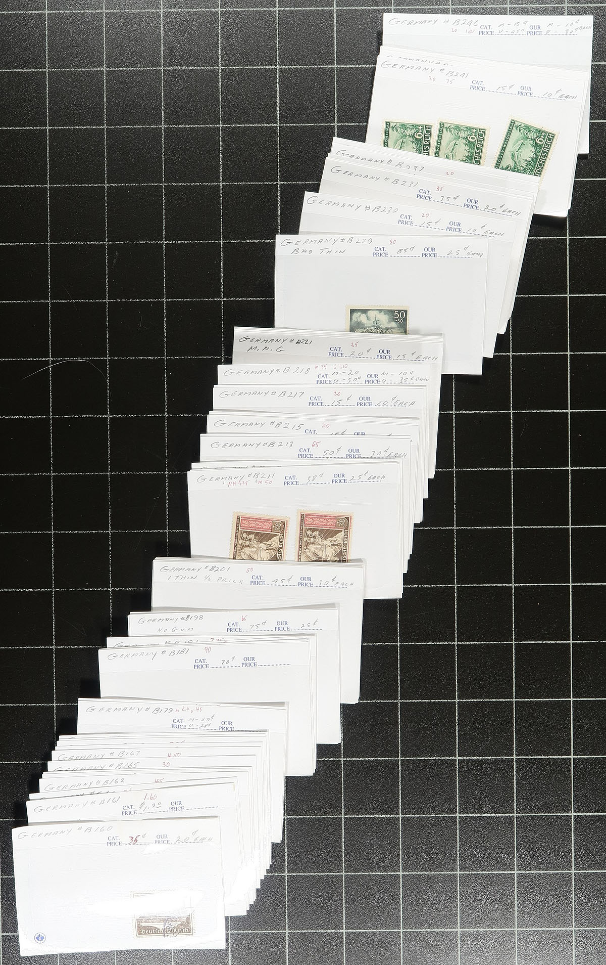 Several hundred stamps, neatly arranged and organized on old dealer stock "102" cards being only "back of the book" Semi Postal and Official stamps. These cards were arranged and catalogued back in 2006 by the previous owner. Expect some faults and mild duplication, but overall a clean lot. Owner's much older 2006 Scott US$663.00 ($854.55 CDN). Estimate =