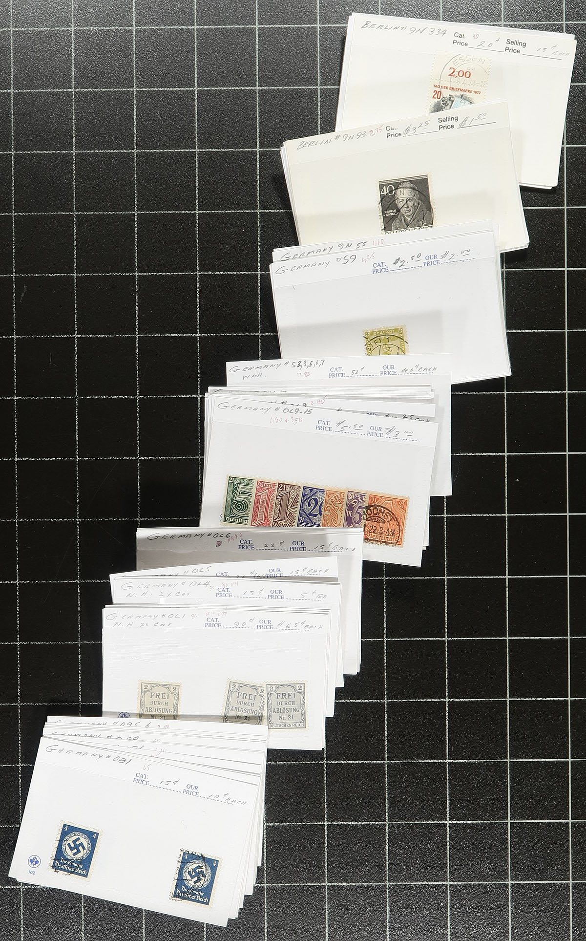 Several hundred stamps, neatly arranged and organized on old dealer stock "102" cards being only "back of the book" Semi Postal and Official stamps. These cards were arranged and catalogued back in 2006 by the previous owner. Expect some faults and mild duplication, but overall a clean lot. Owner's much older 2006 Scott US$663.00 ($854.55 CDN). Estimate =