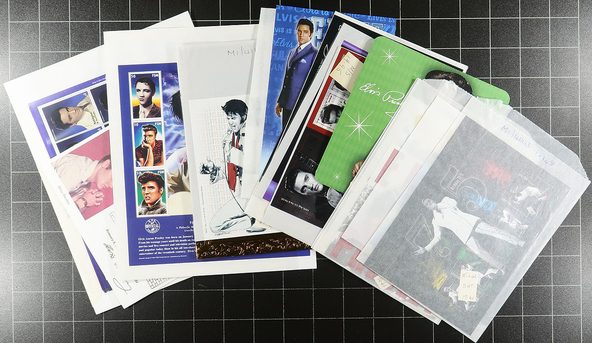 Elvis Topical Collector Hoard. This collector was still an active buyer of everything Elvis up until a few years ago, with most of the recent purchases being compiled in this small box. As with many collections which delve into the more modern material, the more recent material is often the most expensive. This small box is packed with "new issues" from about 2010 onwards and a bit of ephemera (most with their original price tags still on them). Overall condition is excellent. The original cost of this material was over $1000.00. Estimate =