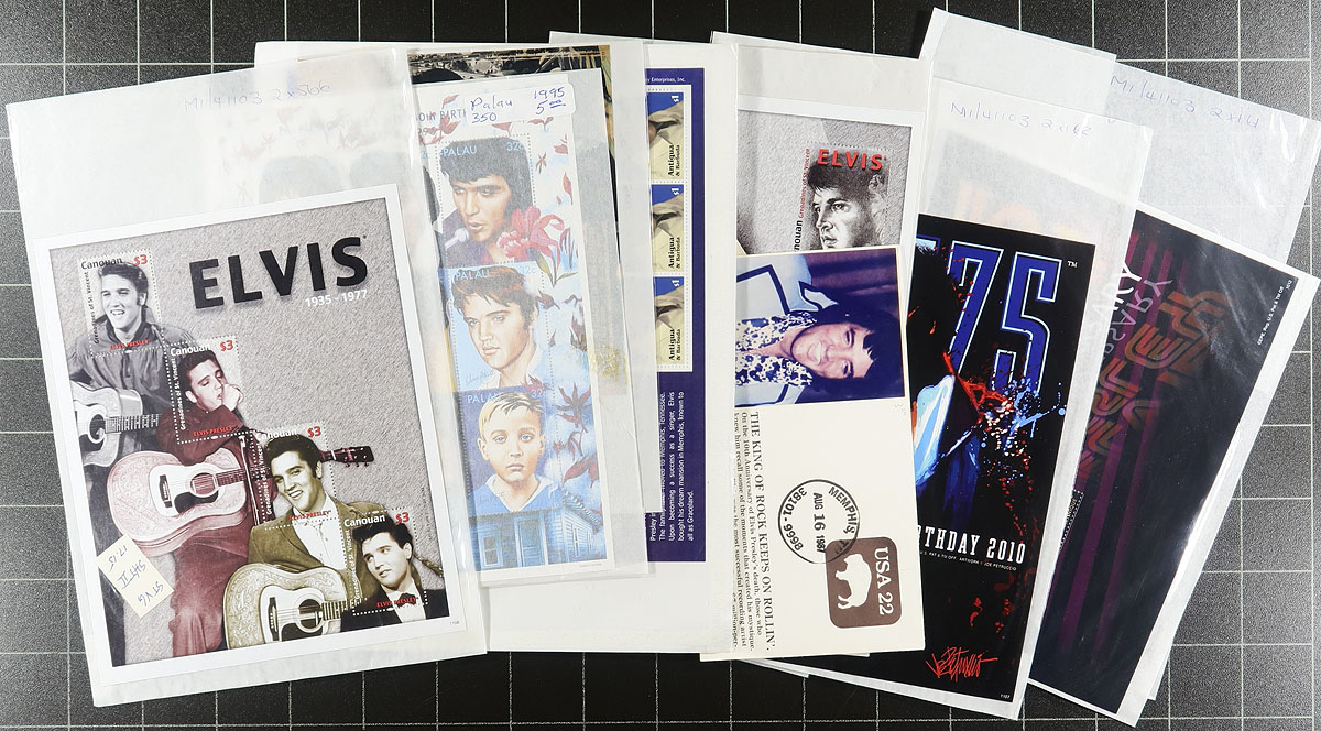 Elvis Topical Collector Hoard. This collector was still an active buyer of everything Elvis up until a few years ago, with most of the recent purchases being compiled in this small box. As with many collections which delve into the more modern material, the more recent material is often the most expensive. This small box is packed with "new issues" from about 2010 onwards and a bit of ephemera (most with their original price tags still on them). Overall condition is excellent. The original cost of this material was over $1000.00. Estimate =