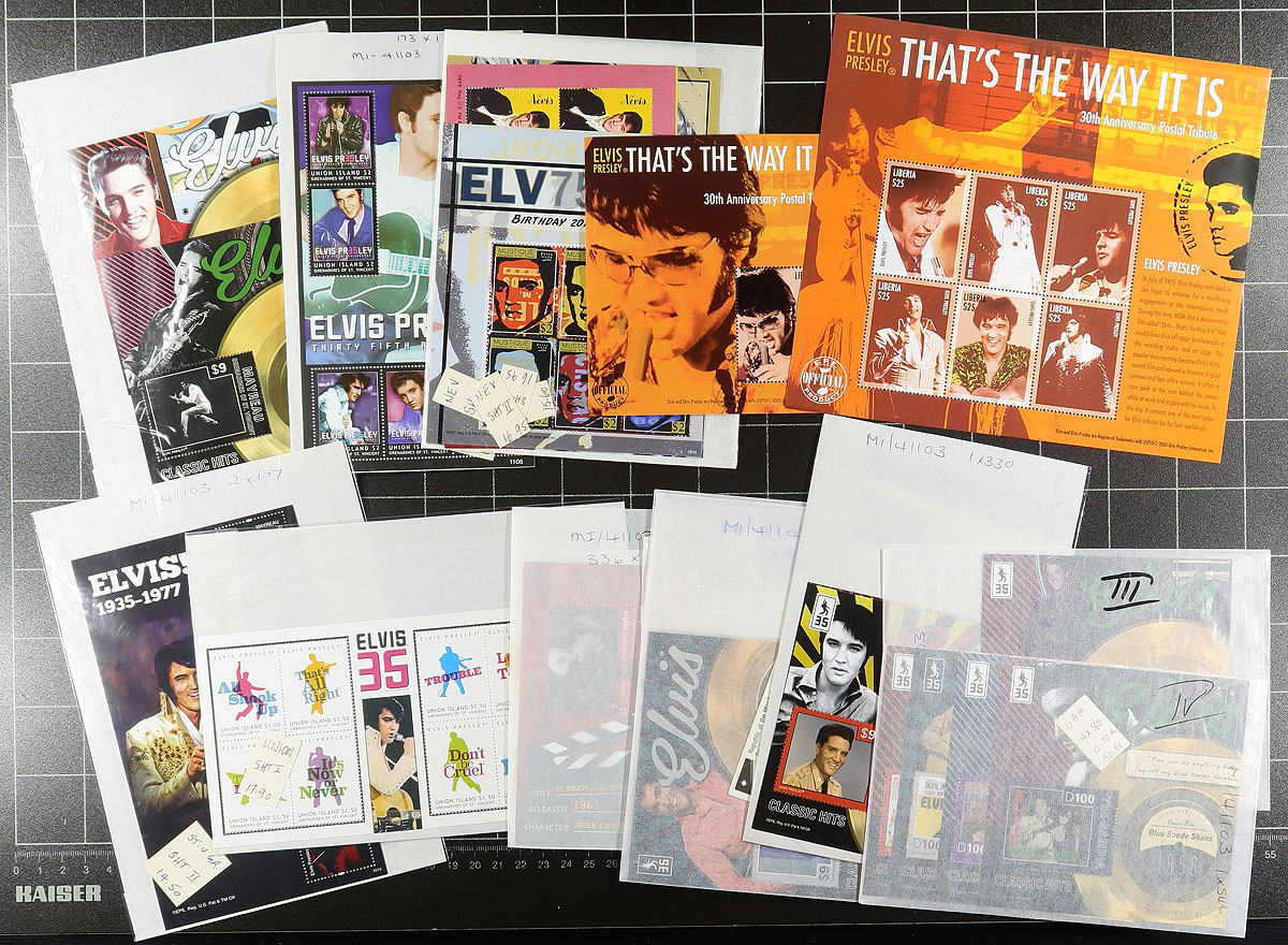 Elvis Topical Collector Hoard. This collector was still an active buyer of everything Elvis up until a few years ago, with most of the recent purchases being compiled in this small box. As with many collections which delve into the more modern material, the more recent material is often the most expensive. This small box is packed with "new issues" from about 2010 onwards and a bit of ephemera (most with their original price tags still on them). Overall condition is excellent. The original cost of this material was over $1000.00. Estimate =