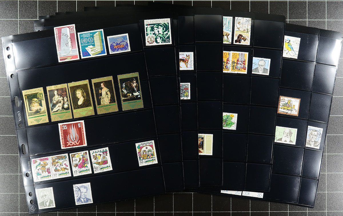 Two binder intermingled accumulation. The German material starts in the inflationary period and then jumps forward to the post-war era, gaining strength in the 1960’s with a mix of mint, used and CTO. Includes some souvenir sheets (adding in a few "Berlin" issues here) and multiples of DDR, including #2071-2085 in full CTO sheets of 100. The second binder is almost exclusively DDR back to about 1950, and resembles more of a collection, all on Vario-brand stocksheets, with multiples and souvenir sheets in this group as well. Throughout there are many items in the $5.00-$20.00 range. Overall the condition is quite good, but expect there to be some duplication. A ton of stamps here! Estimate =