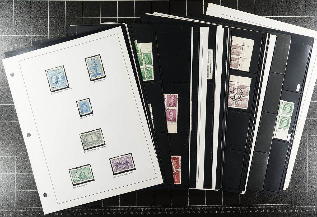 Late GeoVI / early QEII collector accumulation selection of issues, neatly arranged on 16 Vario brand stockpages and 18 computer-generated albums pages . A more specialized collection than often seen, with a range of mint and used that include singles, blocks, plate-blocks, miniature panes and booklet panes with emphasis on used multiples and various paper types (fluorescent types of the QEII era). We noted a $1 Totem used block, paper fluorescent varieties on the QEII Wilding booklet panes, "staple" and "stich" booklet panes and a flurry of different plate number inscription blocks. The mint appears to be a mix of hinged / never-hinged. Take a good look at the photos to appreciate the scope of the lot. Estimate =