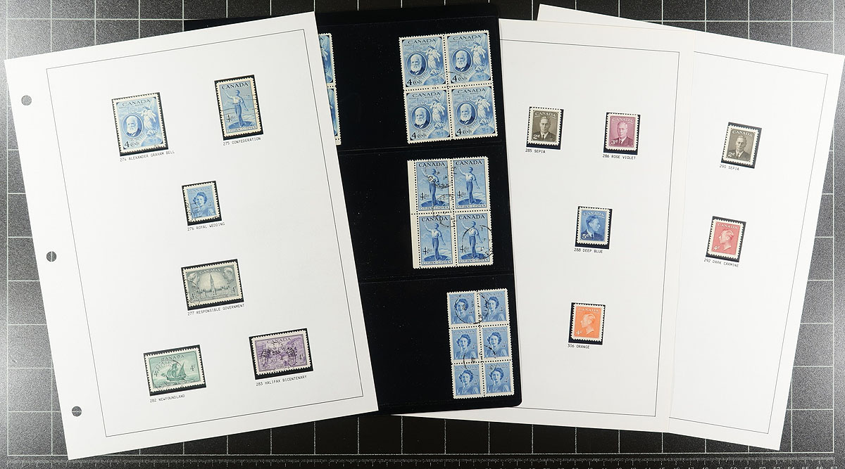 Late GeoVI / early QEII collector accumulation selection of issues, neatly arranged on 16 Vario brand stockpages and 18 computer-generated albums pages . A more specialized collection than often seen, with a range of mint and used that include singles, blocks, plate-blocks, miniature panes and booklet panes with emphasis on used multiples and various paper types (fluorescent types of the QEII era). We noted a $1 Totem used block, paper fluorescent varieties on the QEII Wilding booklet panes, "staple" and "stich" booklet panes and a flurry of different plate number inscription blocks. The mint appears to be a mix of hinged / never-hinged. Take a good look at the photos to appreciate the scope of the lot. Estimate =