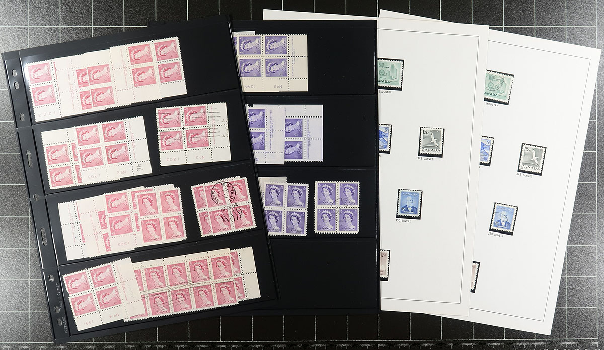Late GeoVI / early QEII collector accumulation selection of issues, neatly arranged on 16 Vario brand stockpages and 18 computer-generated albums pages . A more specialized collection than often seen, with a range of mint and used that include singles, blocks, plate-blocks, miniature panes and booklet panes with emphasis on used multiples and various paper types (fluorescent types of the QEII era). We noted a $1 Totem used block, paper fluorescent varieties on the QEII Wilding booklet panes, "staple" and "stich" booklet panes and a flurry of different plate number inscription blocks. The mint appears to be a mix of hinged / never-hinged. Take a good look at the photos to appreciate the scope of the lot. Estimate =