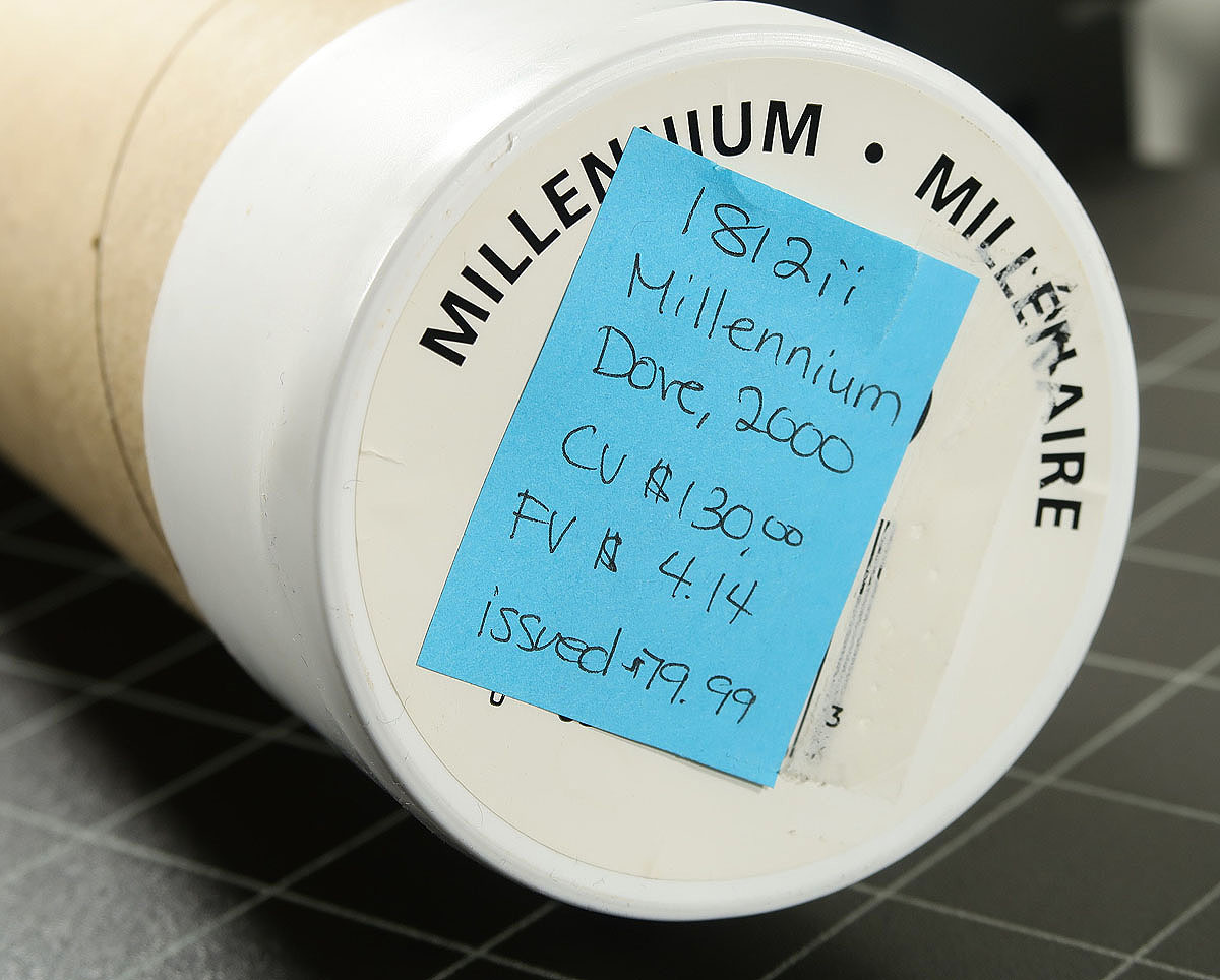 The 2000 "Millennium Dove" hologram uncut press sheet. Signed by André Ouellet, the Chairman of Canada Post at the time of issue. Very popular, despite the enormous purchase price of $79.95 (in comparison to other uncut press sheets at the time). 2025 / 2026 Unitrade =