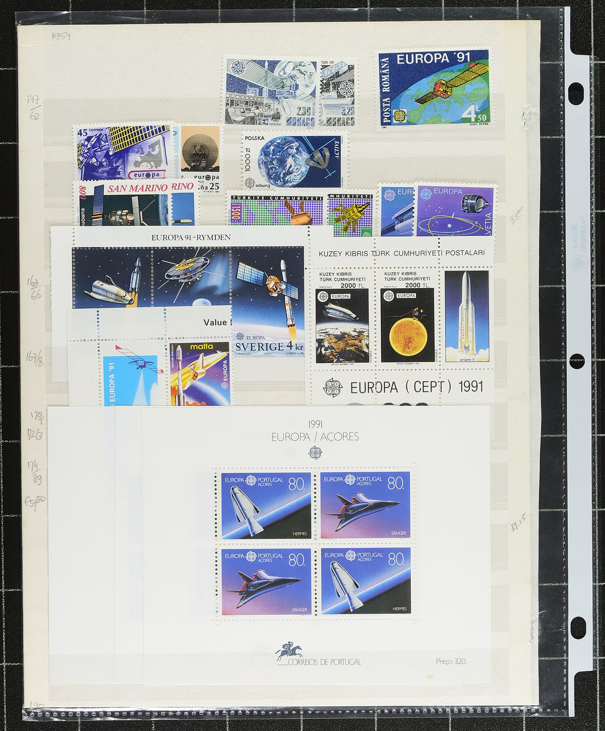 Europa/CEPT mint and used issues, nicely displayed on black stockpages. Starting with complete mint Never Hinged issues from 1975 (including a large Monaco souvenir sheet), followed by the 1991 space exploration and 1992 Christopher Columbus issues (both include several souvenir sheets). The final three pages cover an assortment of issues from 1980-1999, with the individual stamps being nicely used, but with three mint souvenir sheets. Overall condition is beautiful. Owner’s older 2018 Scott US$610.75 =