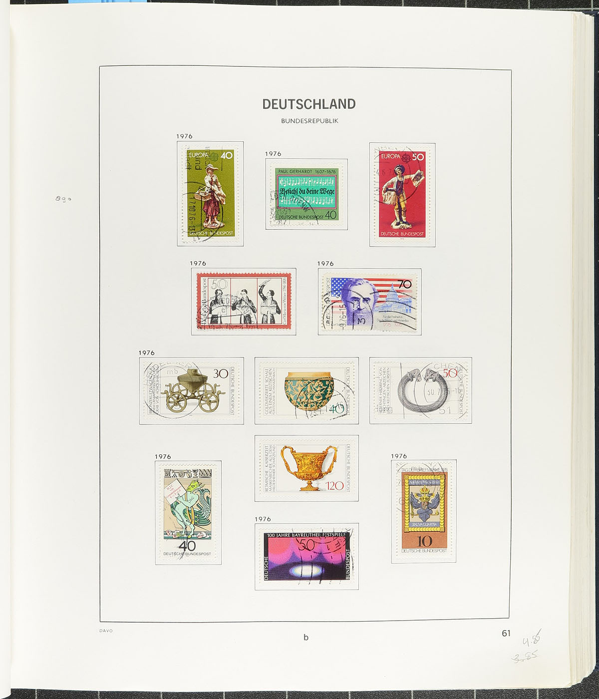 Mint and used modern collection mounted in Davo Album. Includes 565 Germany + 20 souvenir sheets, 1975-1990 issues, mint are mostly NH in acetate mounts; and 610 Berlin + 7 souvenir sheets, 1948-1990 issues. Perhaps a 40-60 split between mint NH and used. Some previously removed but lots of useful remain. A few Back of the Book not counted. Owner used older catalogue. Owner's 2013 Scott US$1,125.00 =