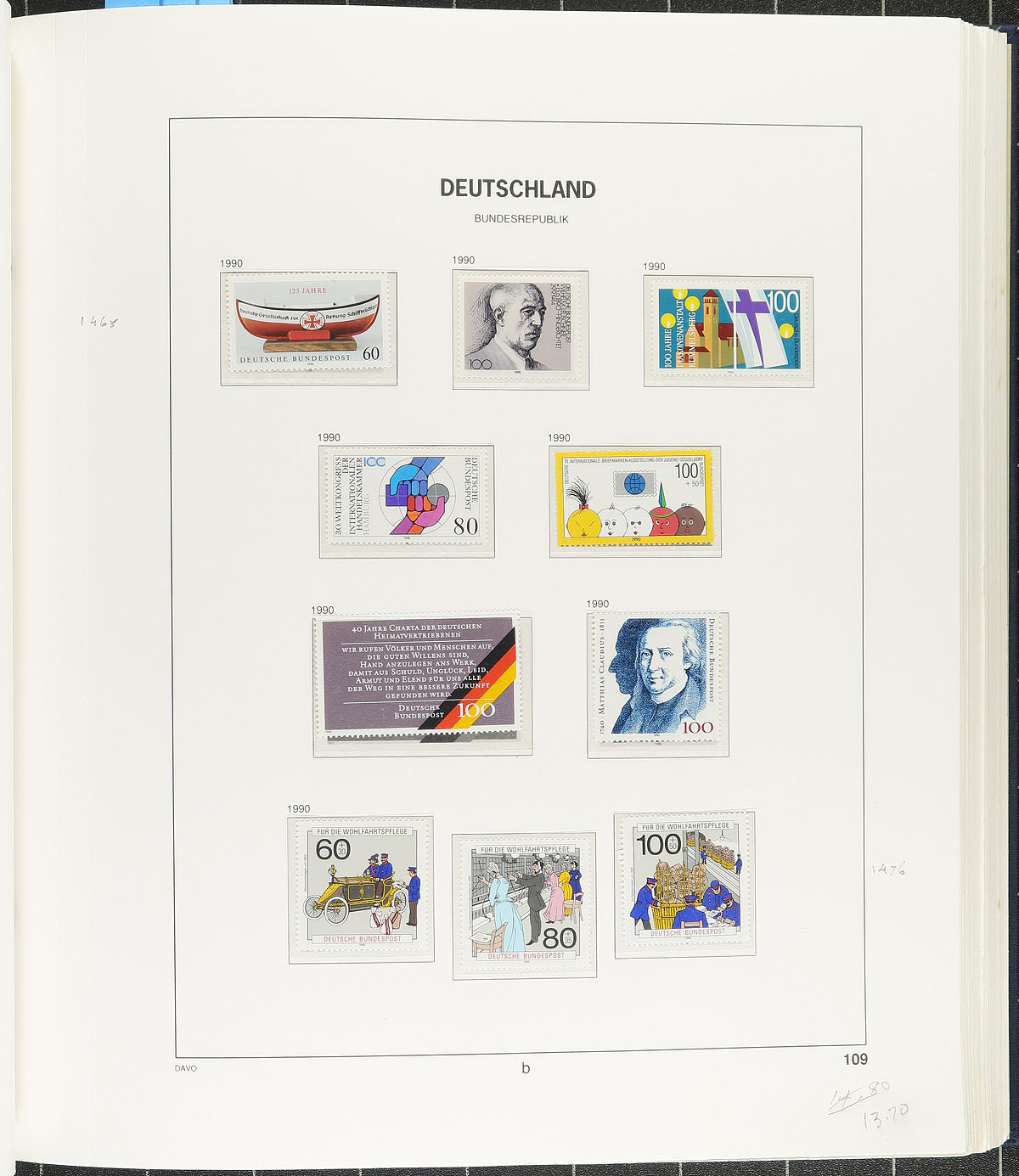 Mint and used modern collection mounted in Davo Album. Includes 565 Germany + 20 souvenir sheets, 1975-1990 issues, mint are mostly NH in acetate mounts; and 610 Berlin + 7 souvenir sheets, 1948-1990 issues. Perhaps a 40-60 split between mint NH and used. Some previously removed but lots of useful remain. A few Back of the Book not counted. Owner used older catalogue. Owner's 2013 Scott US$1,125.00 =