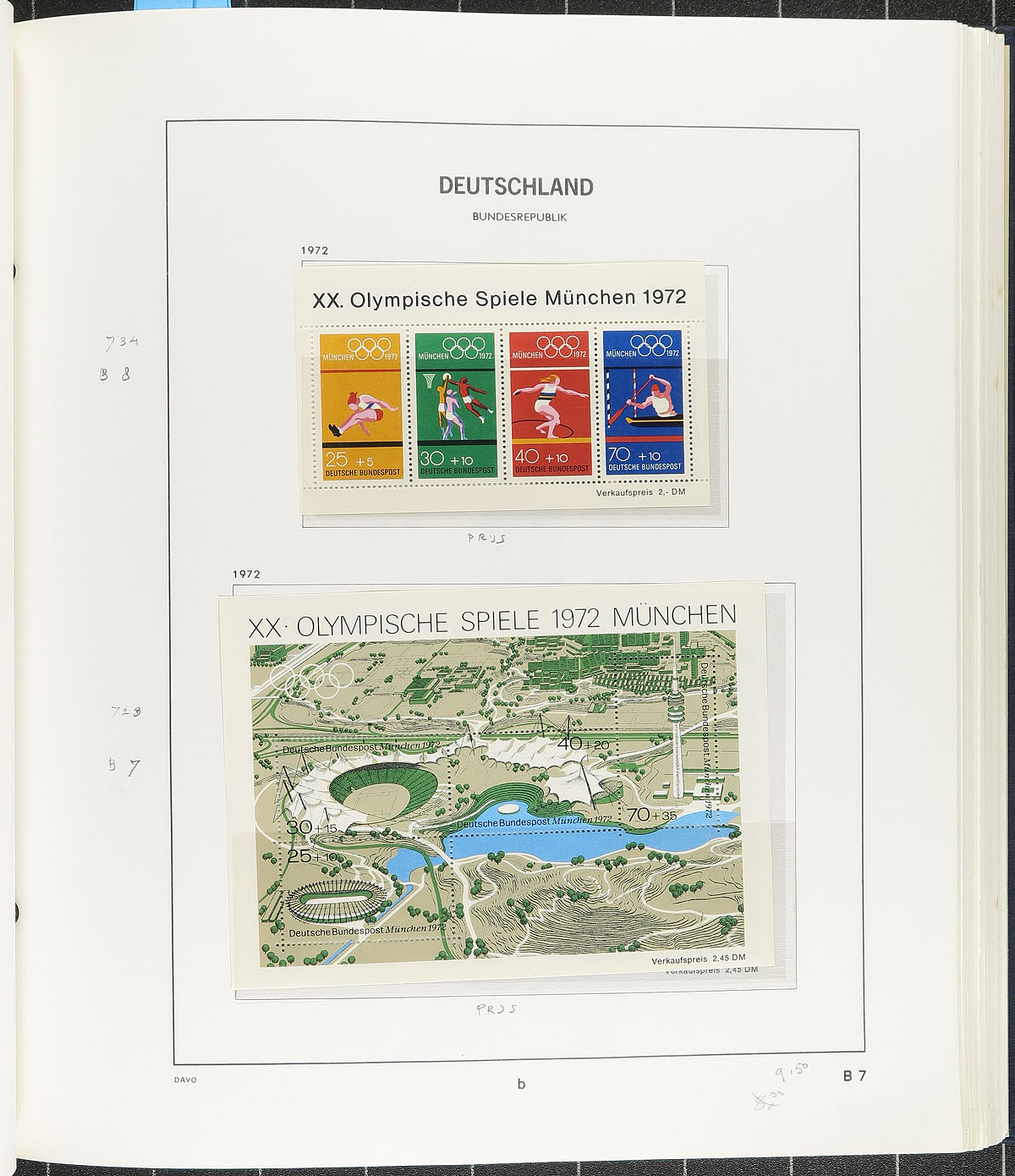 Mint and used modern collection mounted in Davo Album. Includes 565 Germany + 20 souvenir sheets, 1975-1990 issues, mint are mostly NH in acetate mounts; and 610 Berlin + 7 souvenir sheets, 1948-1990 issues. Perhaps a 40-60 split between mint NH and used. Some previously removed but lots of useful remain. A few Back of the Book not counted. Owner used older catalogue. Owner's 2013 Scott US$1,125.00 =