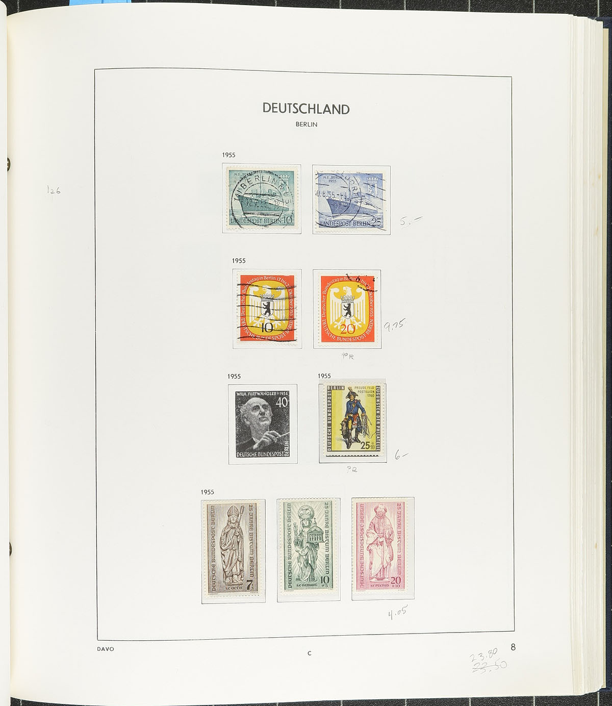 Mint and used modern collection mounted in Davo Album. Includes 565 Germany + 20 souvenir sheets, 1975-1990 issues, mint are mostly NH in acetate mounts; and 610 Berlin + 7 souvenir sheets, 1948-1990 issues. Perhaps a 40-60 split between mint NH and used. Some previously removed but lots of useful remain. A few Back of the Book not counted. Owner used older catalogue. Owner's 2013 Scott US$1,125.00 =