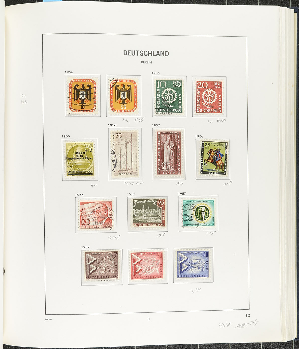 Mint and used modern collection mounted in Davo Album. Includes 565 Germany + 20 souvenir sheets, 1975-1990 issues, mint are mostly NH in acetate mounts; and 610 Berlin + 7 souvenir sheets, 1948-1990 issues. Perhaps a 40-60 split between mint NH and used. Some previously removed but lots of useful remain. A few Back of the Book not counted. Owner used older catalogue. Owner's 2013 Scott US$1,125.00 =