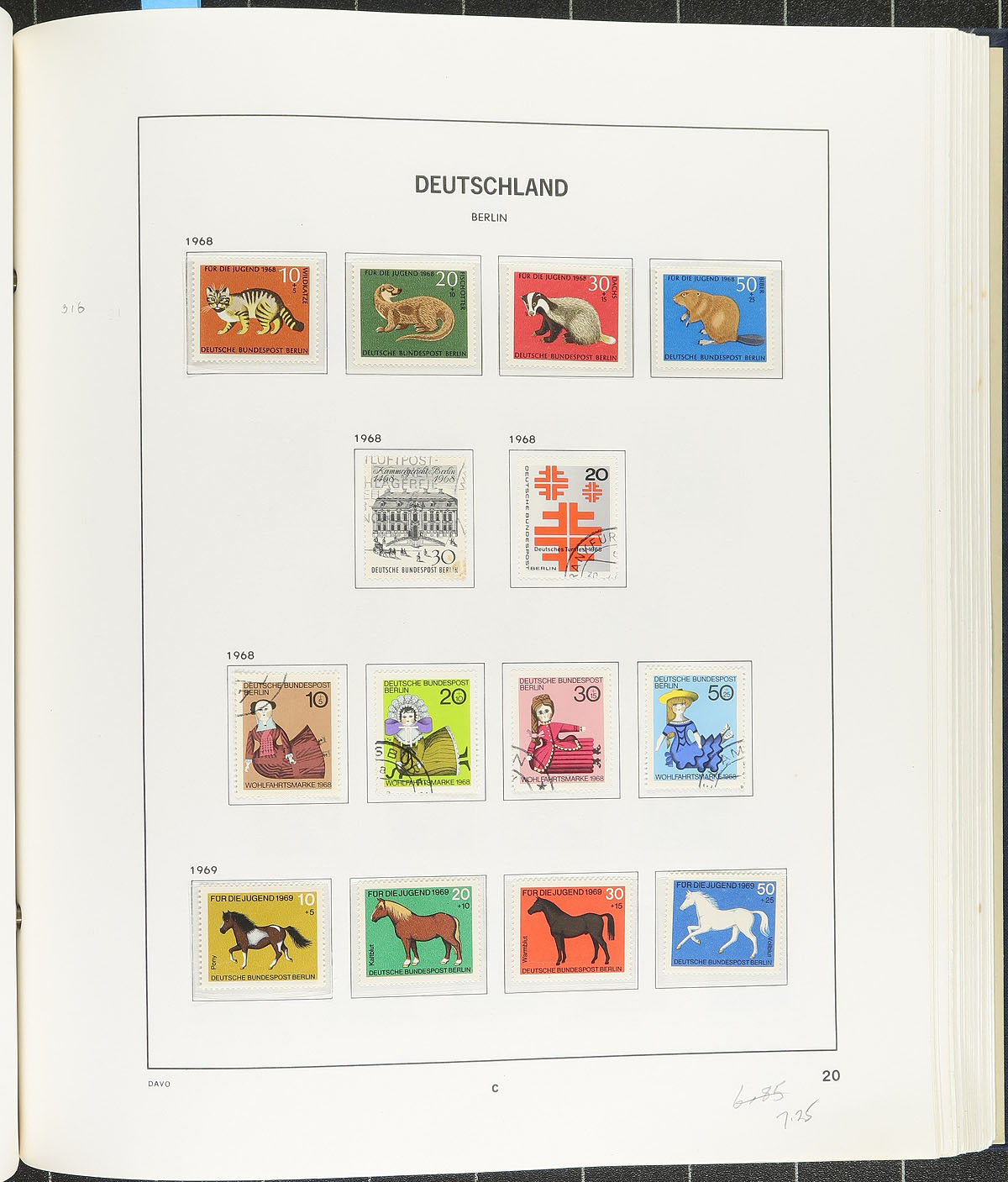 Mint and used modern collection mounted in Davo Album. Includes 565 Germany + 20 souvenir sheets, 1975-1990 issues, mint are mostly NH in acetate mounts; and 610 Berlin + 7 souvenir sheets, 1948-1990 issues. Perhaps a 40-60 split between mint NH and used. Some previously removed but lots of useful remain. A few Back of the Book not counted. Owner used older catalogue. Owner's 2013 Scott US$1,125.00 =