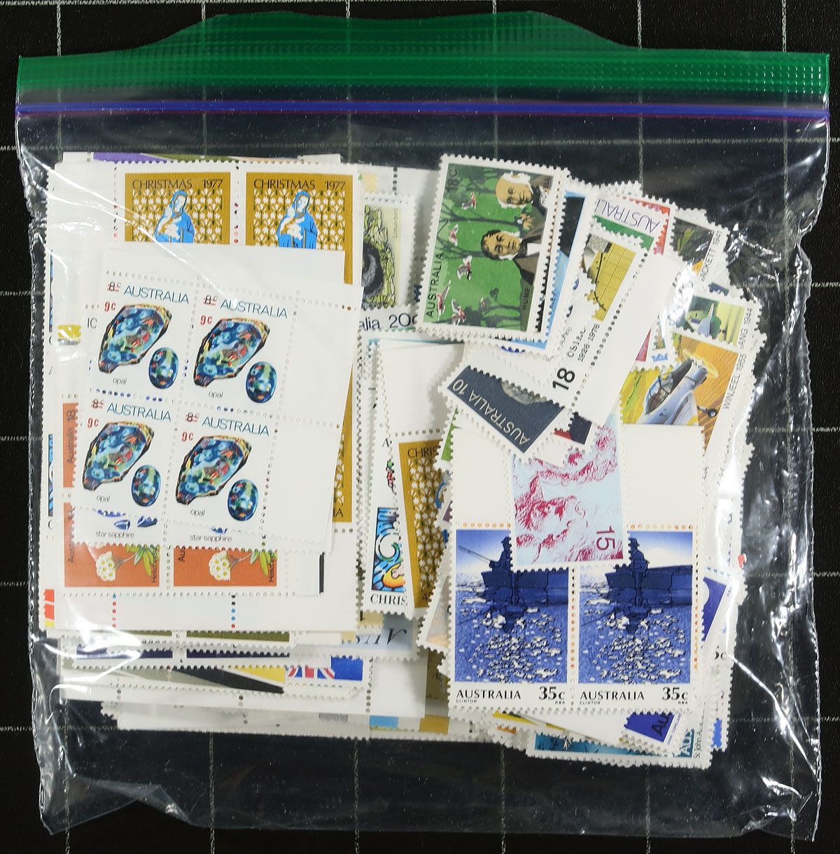 Modern Postage Cornucopia! Clean and varied decimal currency "plus value" mint (almost all NH) group, including singles, sets, blocks, souvenir sheets, thematic folders collector's packs and a 1982 hardcover yearbook. Lots of better higher values! Offered as received. Didn't check for higher catalogue value items. Conservatively valued as face value postage only. Total useable Face Value $816.00 AUD = $742.80 CDN. Estimate =