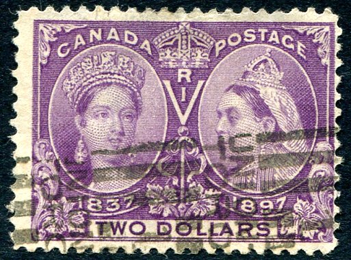 Fine centered used example of the $2.00 dark purple 1897 Queen Victoria Jubilee issue. Tidy "UNION ST’N TORONTO" roller cancel. Vibrant colour on this often faded stamp! 2025 Scott US$550.00 =