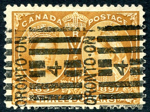 Very Fine centered, used example of the 1897 issue $3.00 yellow bistre QV Jubilee. Bold "TORONTO ONT 4" roller cancel. A great high value Jubilee, with better centering than usually seen. 2025 Scott US$1000.00 =