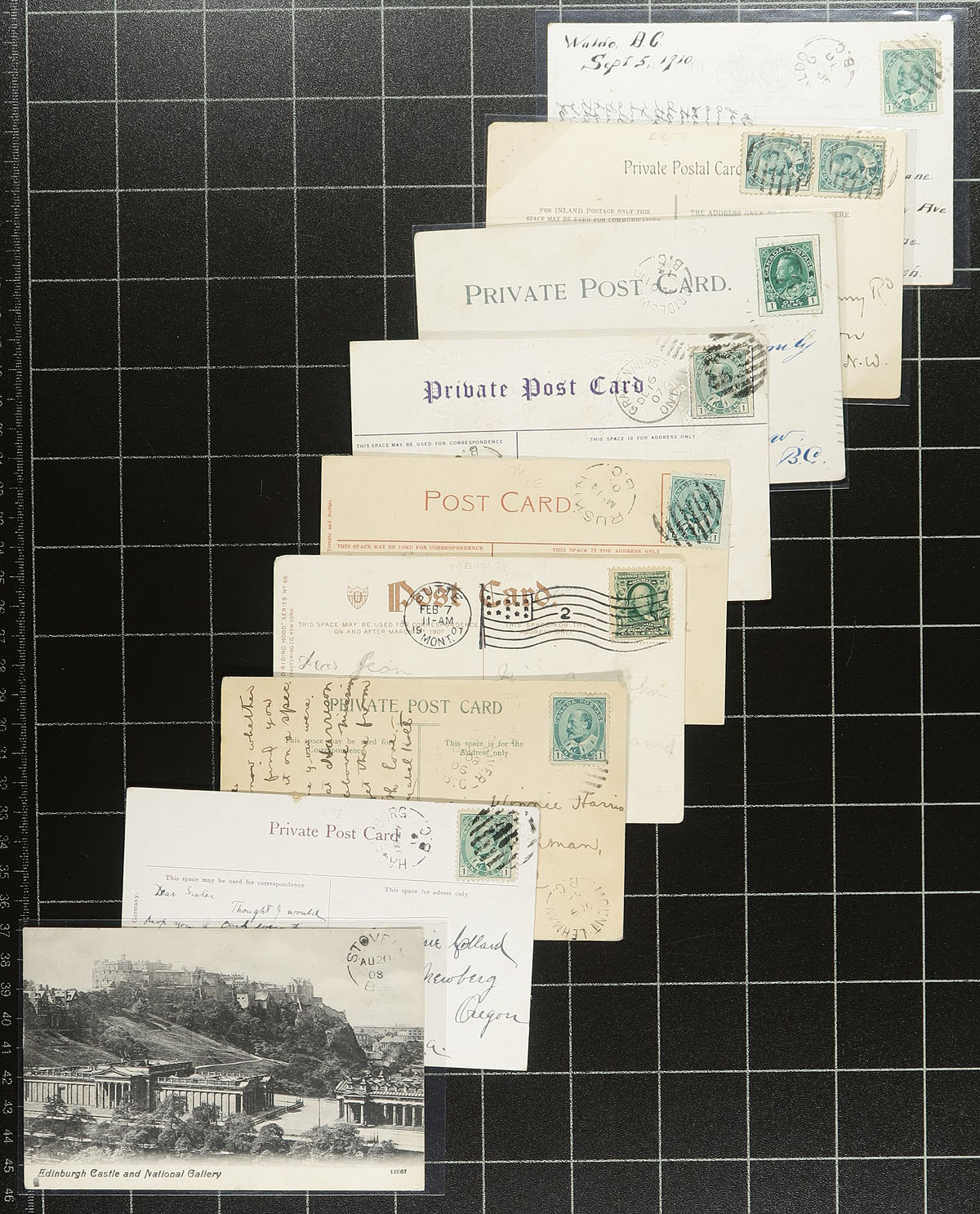 British Columbia Postal History. An old-time holding of 44 (seemingly all different) BC split ring cancels on postcards. Many better closed Post Offices here including Barnet, Clo-oose, Fort George, Ganges, Gellatly, Kingsgate, Maple Bay, Okanagan Landing, Slocan, South Wellington, Stillwater, Hagensborg, North Saanich, Sapperton, Bridesville, Harrison River, Waldo, Burquitlam, Duncans Station, East Burnaby etc (to name a "few"). Of particular note, is that the previous owner noted in pencil on many of these when they were purchased, most from 1976-1979! Off the market for decades. Estimate =