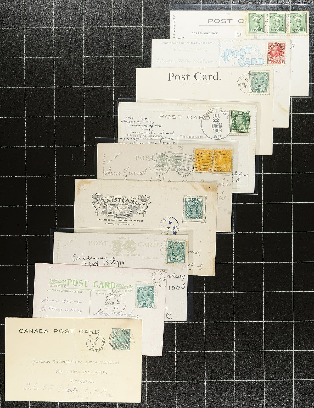 British Columbia Postal History. An old-time holding of 44 (seemingly all different) BC split ring cancels on postcards. Many better closed Post Offices here including Barnet, Clo-oose, Fort George, Ganges, Gellatly, Kingsgate, Maple Bay, Okanagan Landing, Slocan, South Wellington, Stillwater, Hagensborg, North Saanich, Sapperton, Bridesville, Harrison River, Waldo, Burquitlam, Duncans Station, East Burnaby etc (to name a "few"). Of particular note, is that the previous owner noted in pencil on many of these when they were purchased, most from 1976-1979! Off the market for decades. Estimate =