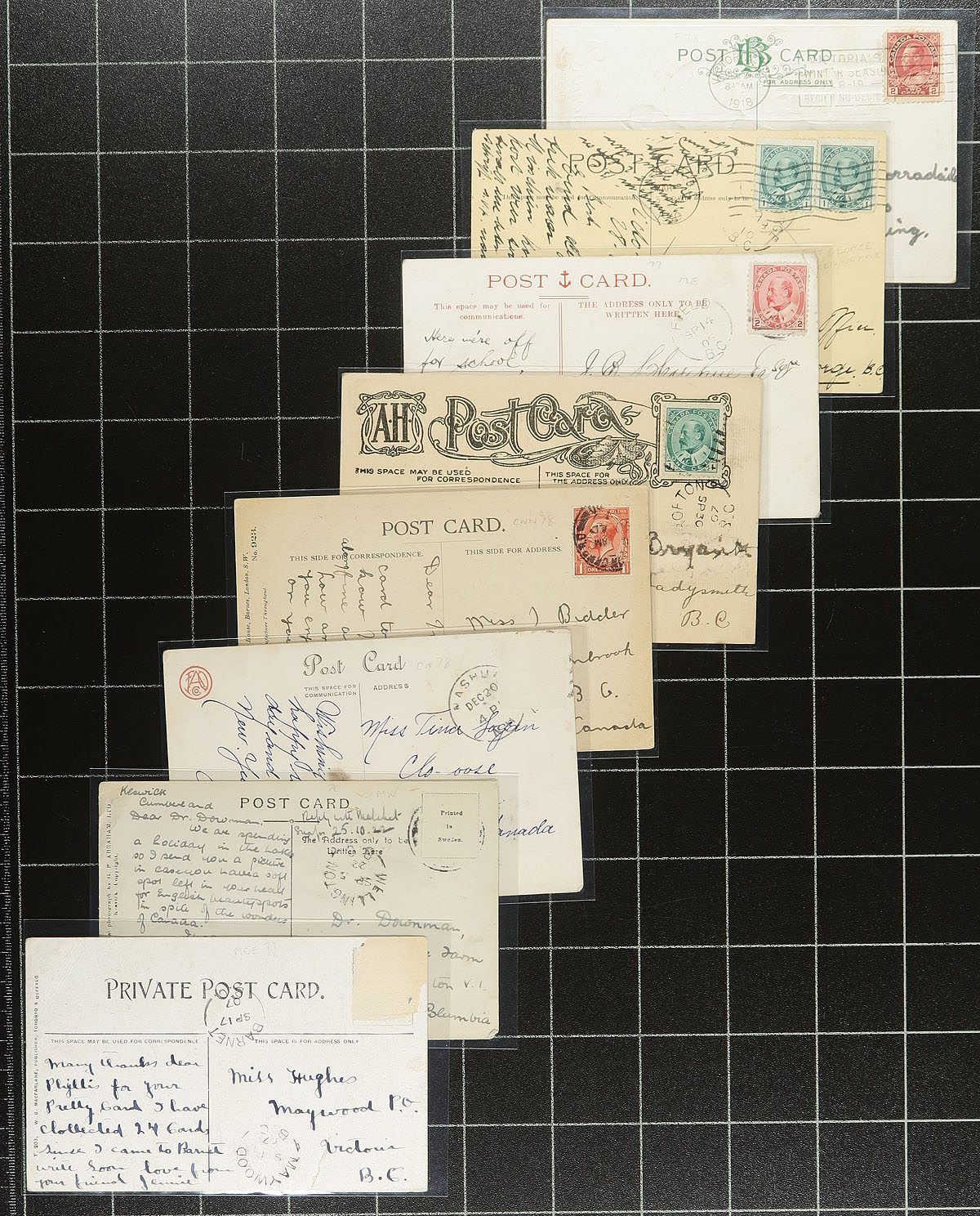 British Columbia Postal History. An old-time holding of 44 (seemingly all different) BC split ring cancels on postcards. Many better closed Post Offices here including Barnet, Clo-oose, Fort George, Ganges, Gellatly, Kingsgate, Maple Bay, Okanagan Landing, Slocan, South Wellington, Stillwater, Hagensborg, North Saanich, Sapperton, Bridesville, Harrison River, Waldo, Burquitlam, Duncans Station, East Burnaby etc (to name a "few"). Of particular note, is that the previous owner noted in pencil on many of these when they were purchased, most from 1976-1979! Off the market for decades. Estimate =