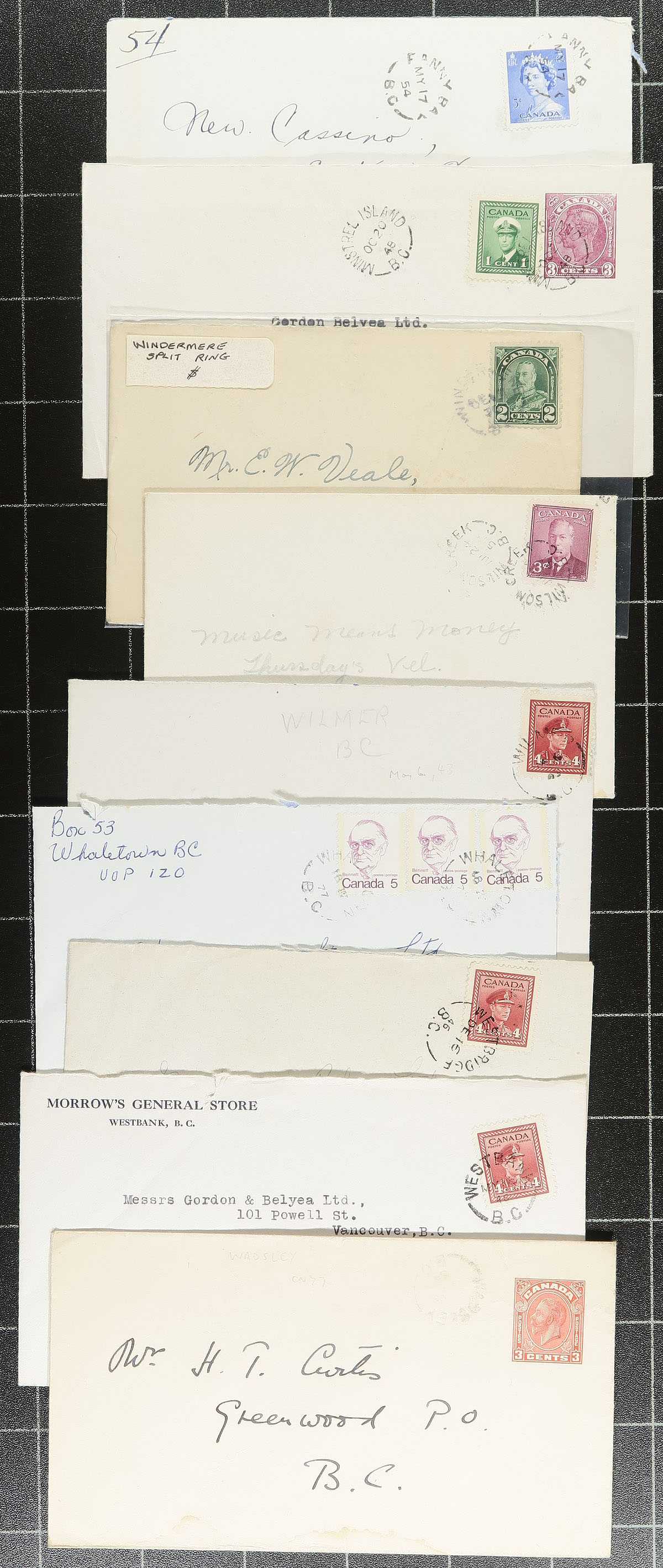 British Columbia Postal History. An all-different assembly of 36 BC split ring cancels on cover, from the George V / George VI / QEII era. Assembled many decades ago, with an eye for better quality strikes and closed Post Offices (and several interesting business corner cards noted). Some of the better towns noted are Burrard Inlet, Gibsons Landing, Irvines Landing (with WWII notched grid to make a "V"), Lund, Pioneer Mine, Port Alberni, Quatsino, Refugee Cove, Seaford, Stuart Island, Thurlow, Tofino, Wadsley, Whaletown and Minstrel Island (to name a few). A great lot for the postmark nut. Estimate =