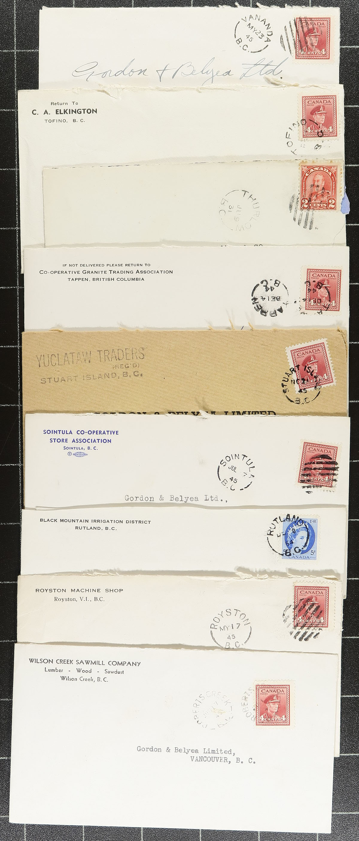 British Columbia Postal History. An all-different assembly of 36 BC split ring cancels on cover, from the George V / George VI / QEII era. Assembled many decades ago, with an eye for better quality strikes and closed Post Offices (and several interesting business corner cards noted). Some of the better towns noted are Burrard Inlet, Gibsons Landing, Irvines Landing (with WWII notched grid to make a "V"), Lund, Pioneer Mine, Port Alberni, Quatsino, Refugee Cove, Seaford, Stuart Island, Thurlow, Tofino, Wadsley, Whaletown and Minstrel Island (to name a few). A great lot for the postmark nut. Estimate =