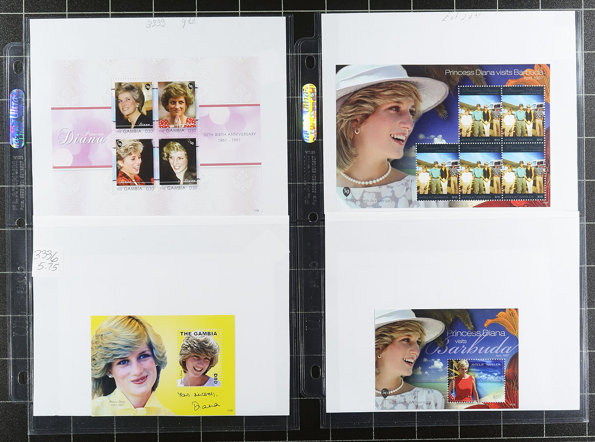 Princes Diana Topical Collection. Mint Never Hinged collection of mostly souvenir sheets honouring Princess Diana. Consists of 6 stamps and 41 souvenir sheets although ten of the souvenir sheets are "Forever sheets" non-philatelic with little or no value (the consignor valued them at $20.00 and this may be the market value). Owners older 2020 Scott US$332.15 =