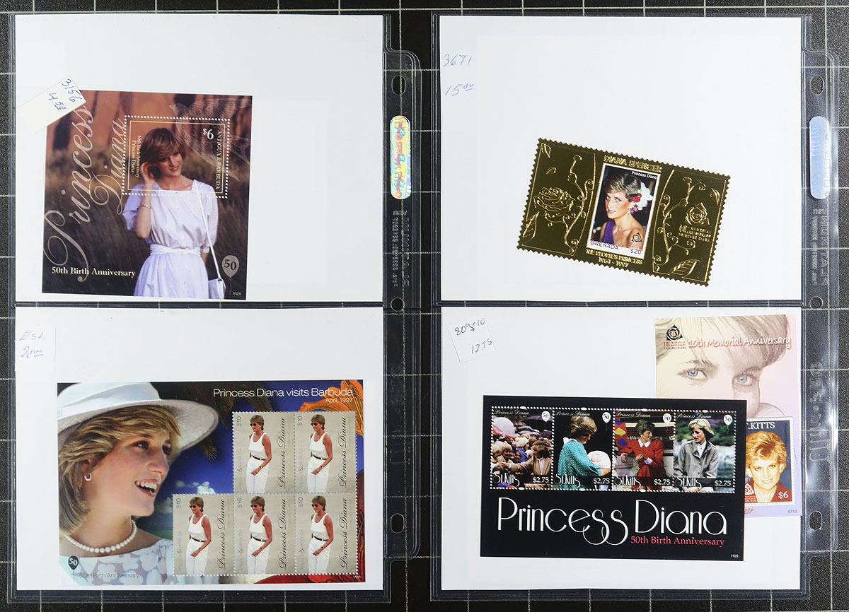 Princes Diana Topical Collection. Mint Never Hinged collection of mostly souvenir sheets honouring Princess Diana. Consists of 6 stamps and 41 souvenir sheets although ten of the souvenir sheets are "Forever sheets" non-philatelic with little or no value (the consignor valued them at $20.00 and this may be the market value). Owners older 2020 Scott US$332.15 =
