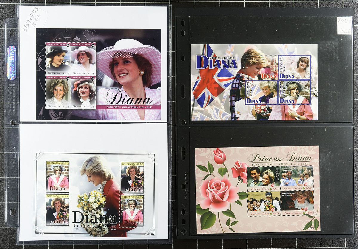 Princes Diana Topical Collection. Mint Never Hinged collection of mostly souvenir sheets honouring Princess Diana. Consists of 6 stamps and 41 souvenir sheets although ten of the souvenir sheets are "Forever sheets" non-philatelic with little or no value (the consignor valued them at $20.00 and this may be the market value). Owners older 2020 Scott US$332.15 =