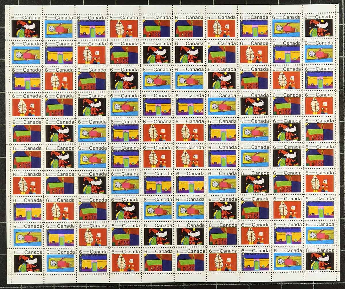 Complete VF mint Never Hinged unfolded se-tenant sheets of 100 of the 1970 issue 5c and 6c Christmas stamps featuring the much sought after identical centre blocks. Each sheet is valued by Unitrade as one centre block, four plate blocks of ten, eight strips of five and sixteen singles. The 6c in the centre block has the "scratch through window" and the 5c in the centre block has the "dot between M and A". Each VF MNH sheet is brilliantly pristine and NEVER FOLDED (very uncommon for this large-format sheet). 2025-2026 Unitrade =