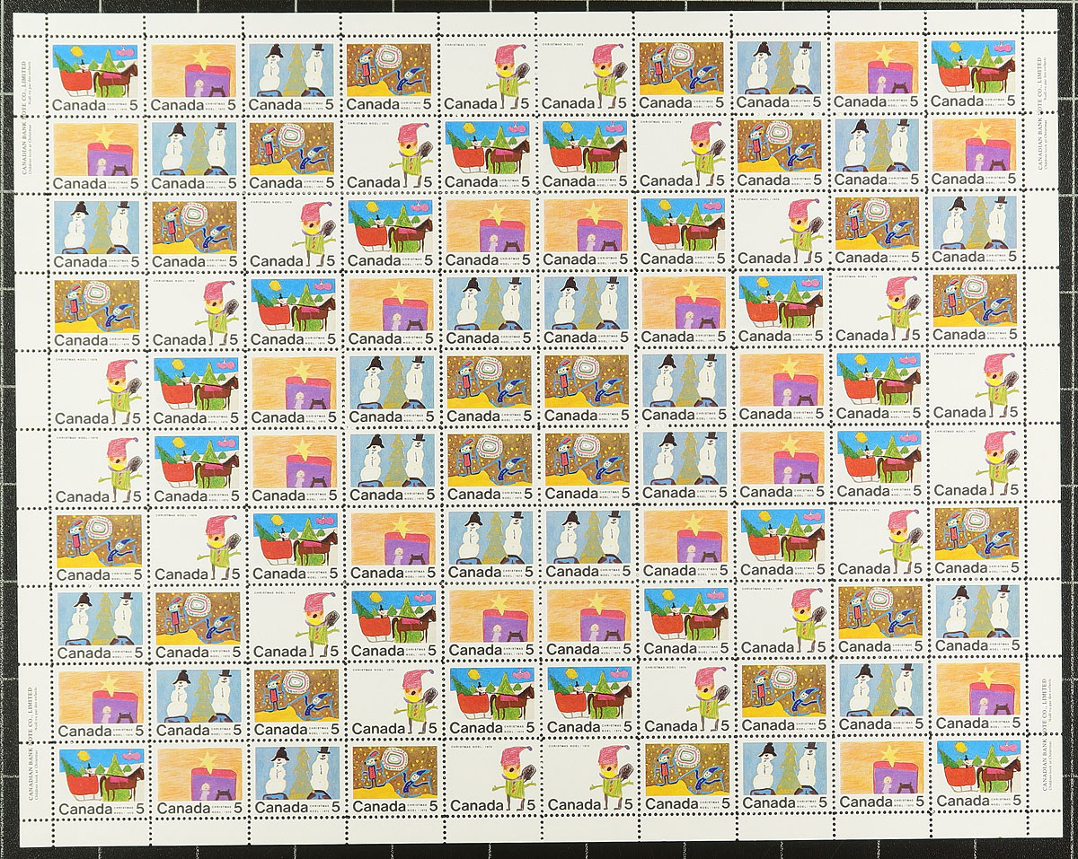 Post Office Fresh and unfolded VF mint Never Hinged panes of 100 of the Winnipeg tagged 5c and 6c Christmas "Childrens' Drawings" 1970 issue with the rare identical centre blocks of 4. The 5c pane shows the "Dot between M & A" variety at position 56 and the 6c pane has the "Scratch Through Window" variety at position 45. Absolutely pristine and unblemished gum, no perf separations. These are the nicest pair of Winnipeg tagged sheets we've had in years. 2025-2026 Unitrade =