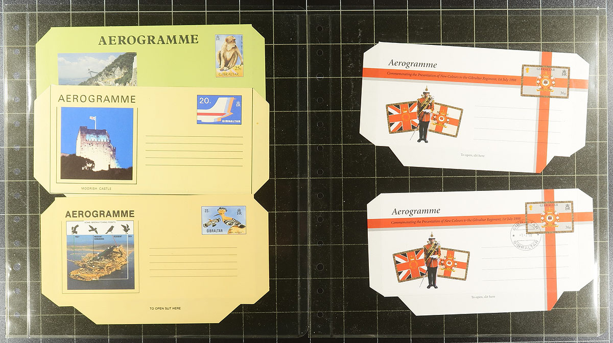 Gibraltar Postal Stationery Air Letters / Aerogrammes 1950's-1990's. A very clean collection of 29x unused and 6x used, arranged on a dozen album pages, noting 24 different issues. A nice offering from this popular collecting country. Estimate =